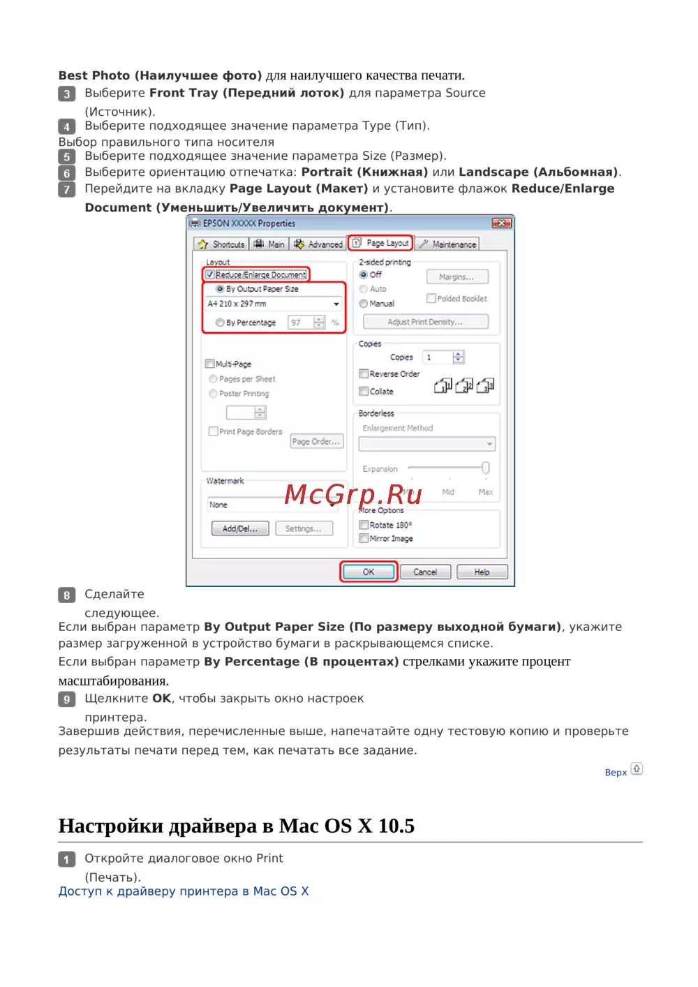 - В mac os x выберите print settings параметры печати в окне print печать драйвера p.165