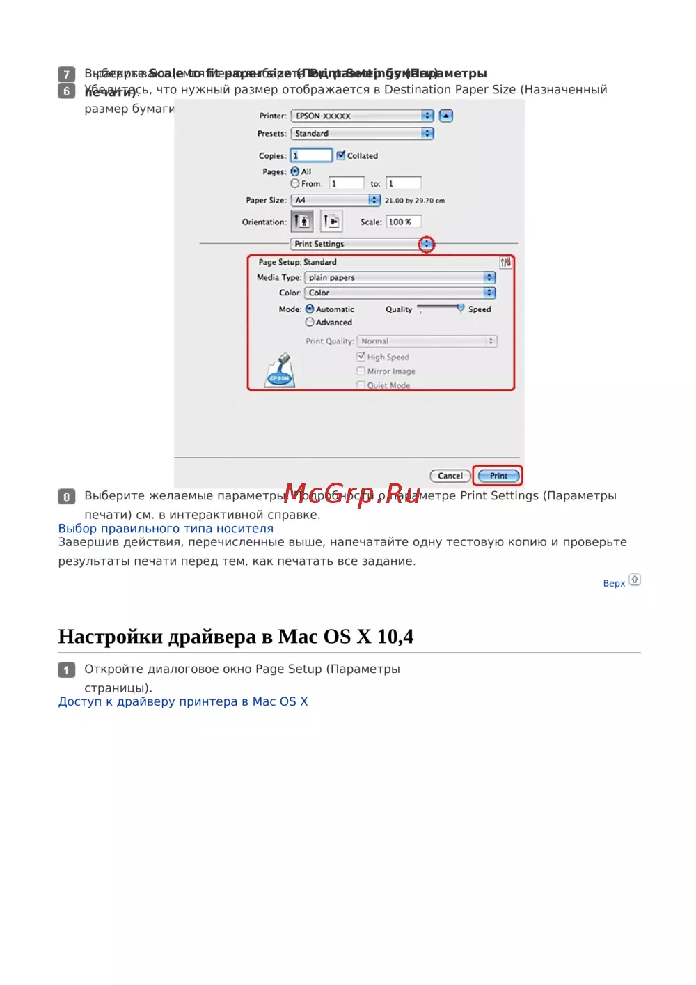 Настройки драйвера в)Mac OS X 10,4