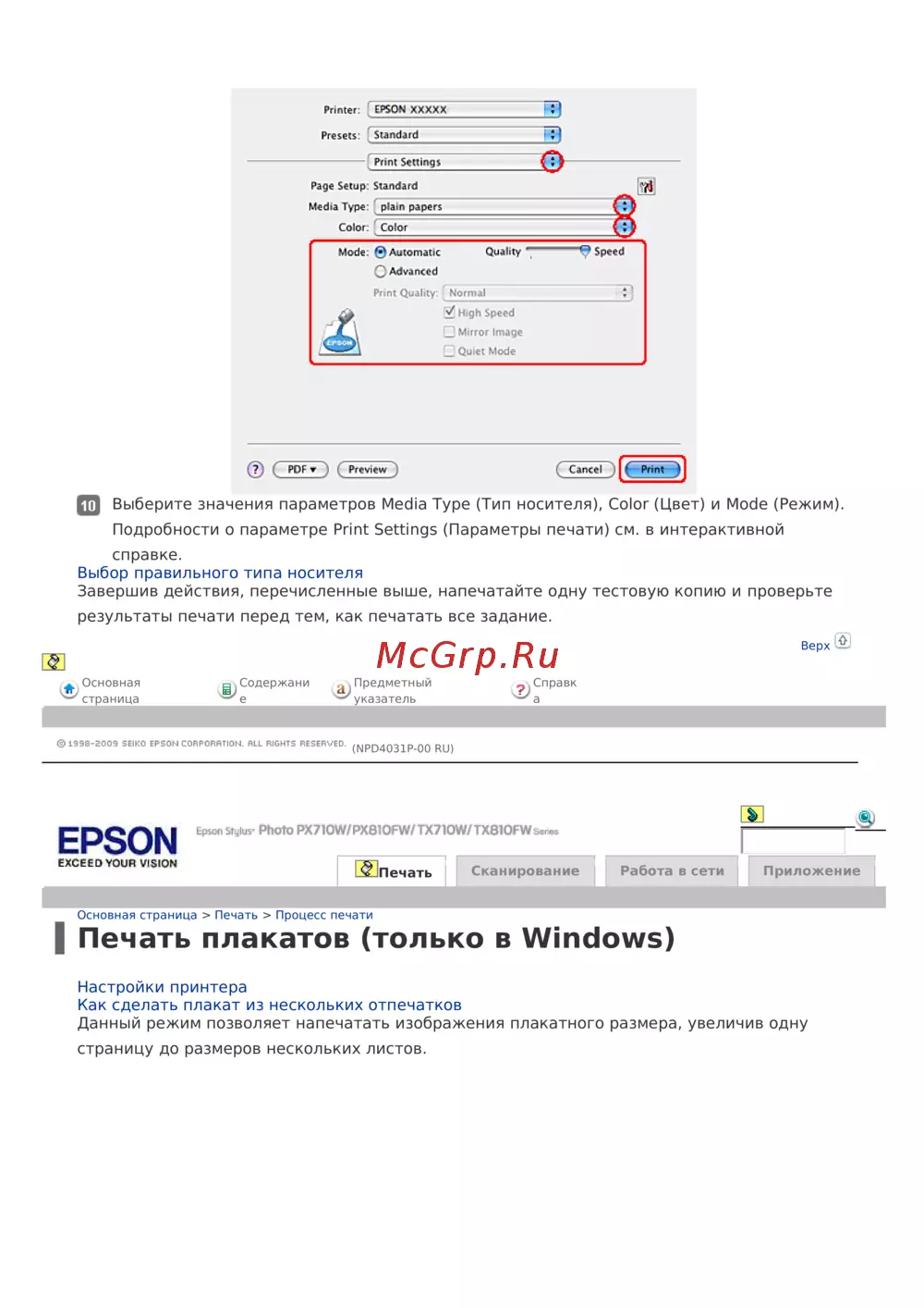 Подробности опараметре Print Settings (Параметры печати) см.винтерактивной