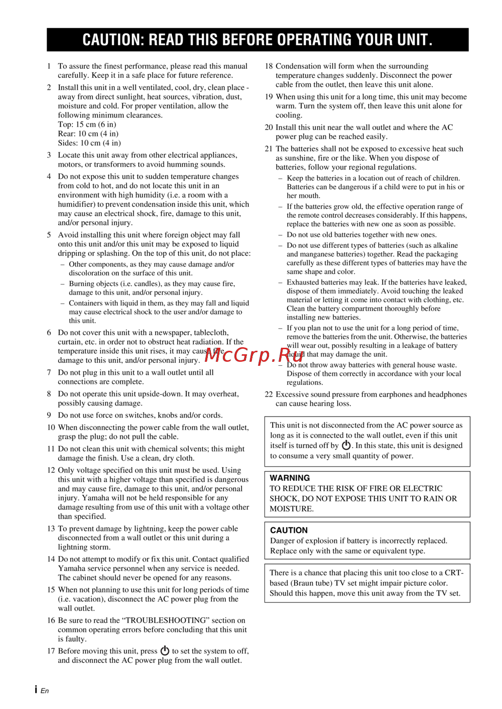 2 Install this unit in a well ventilated, cool, dry, clean place