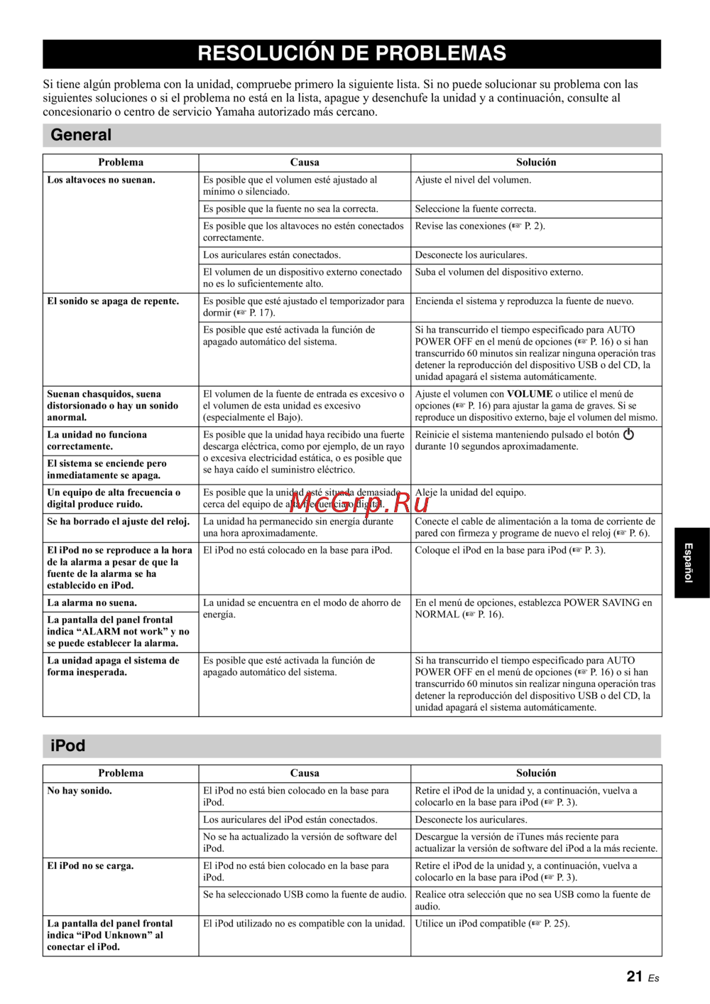 - В случае возникновения проблем при использовании устройства сначала обратитесь к следующему списку если устранить проблему с помощью предложенных способов не удается или если проблема не указана в списке выключите систему и отсоедините от сети электропитания затем обратитесь к ближайшему авторизованному дилеру yamaha или в сервисный центр p.207