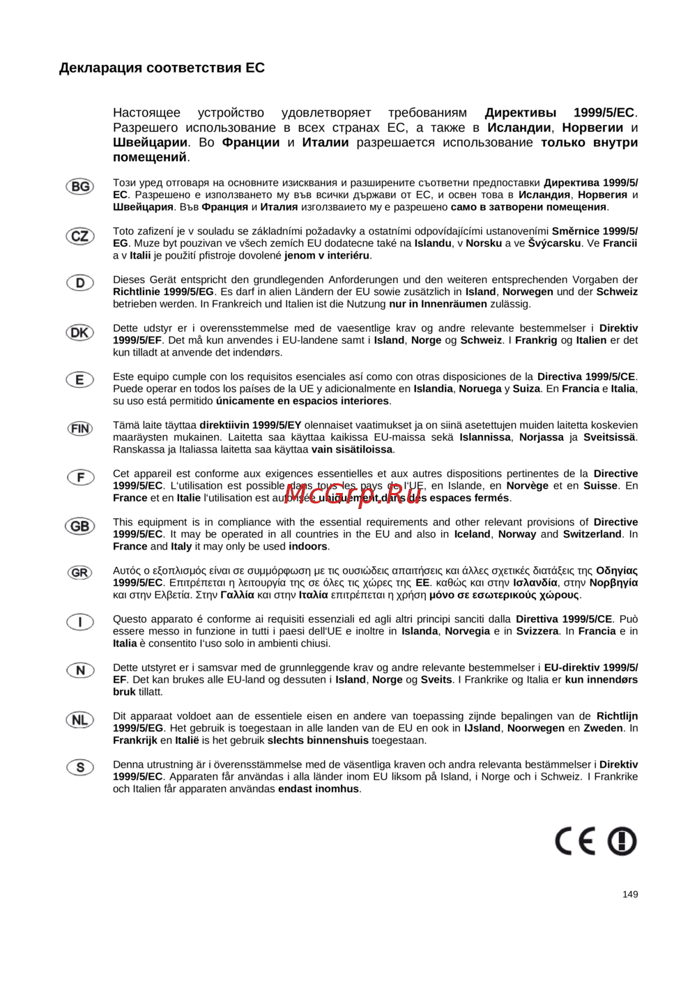 1999/5/ΕC. Επιτρέπεται η λειτουργία της σε όλες τις χώρες της ΕΕ. καθώς και στην Ισλανδία, στην Νορβηγία