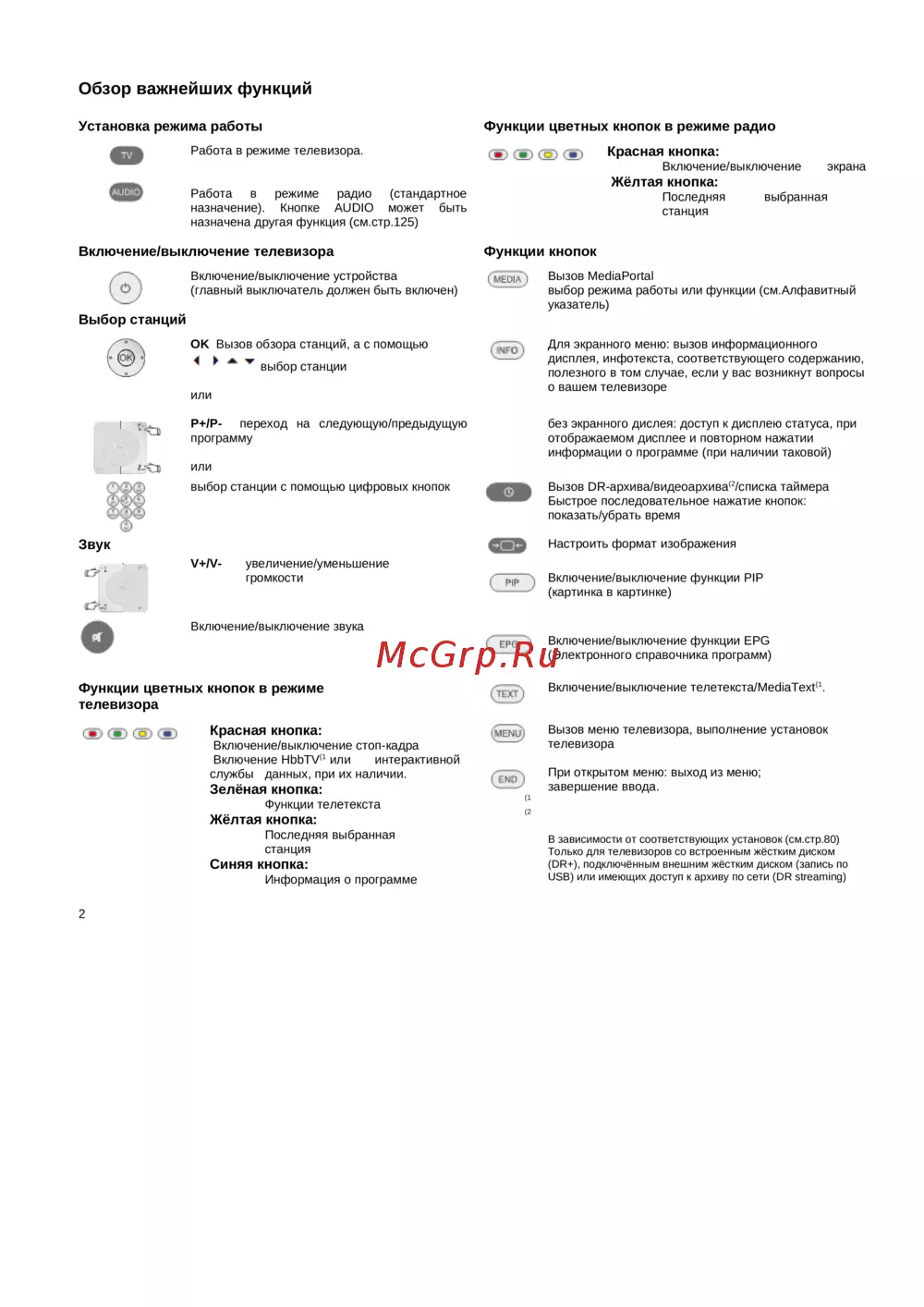 - Указанное на иллюстрации назначение кнопок действительно для уровня главного меню телевизора назначение кнопок может изменяться в зависимости от различных режимов работы см соответствующие главы настоящего руководства по эксплуатации p.4