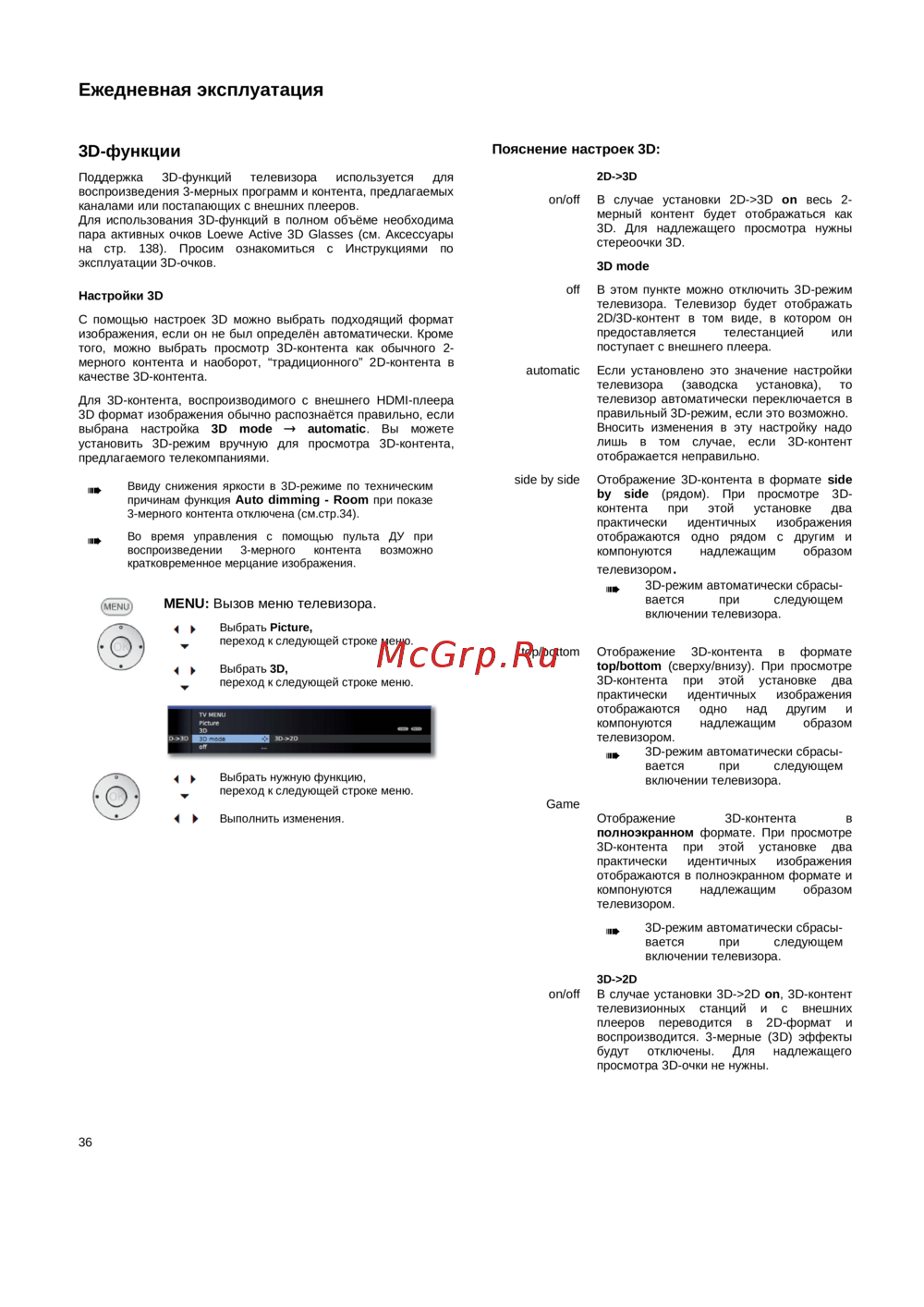 Узнайте, как правильно использовать 3D-функции вашего телевизора, включая настройки и режимы отображения 3D-контента. Подробные инструкции по эксплуатации.