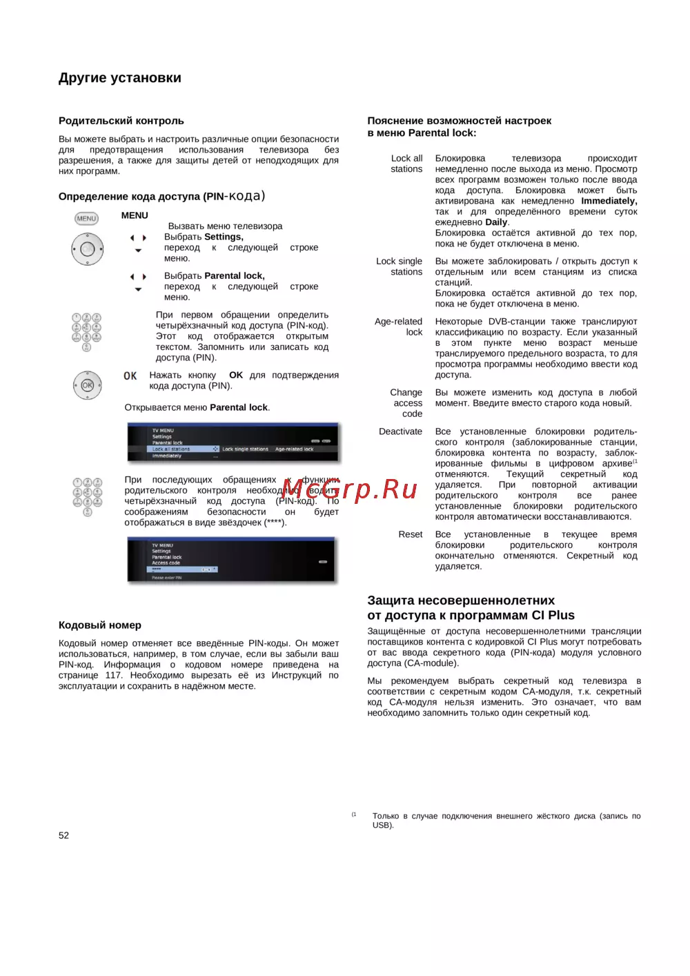 - Кодовый номер отменяет код доступа и тем самым функцию родительского контроля хранить этот номер в безопасном месте p.126