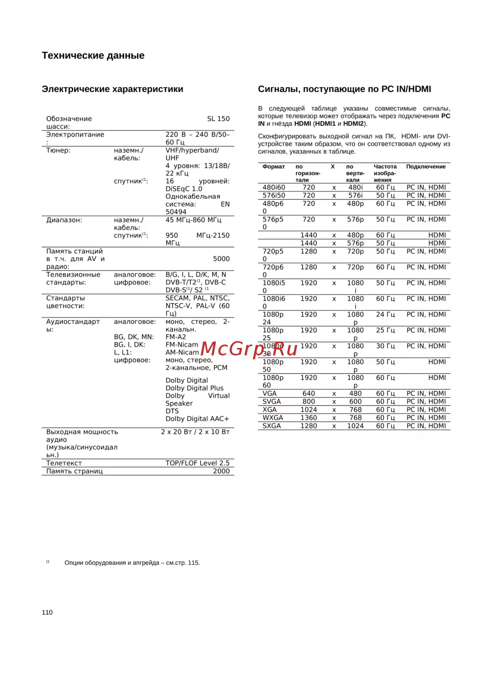 - Электрические характеристики сигналы поступающие по pc in hdmi p.119
