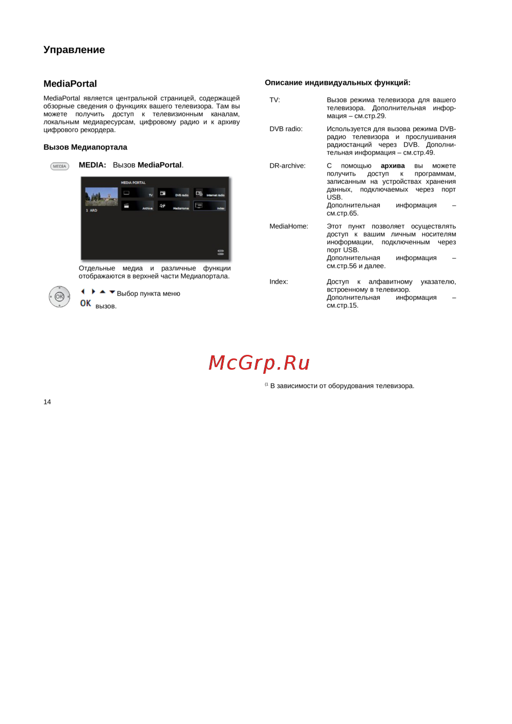 - Для вызова меню в отдельных режимах телевизора радиотюнера pip epg телетекста медиапортала и архива цифрового рекордера видеоархив p.13