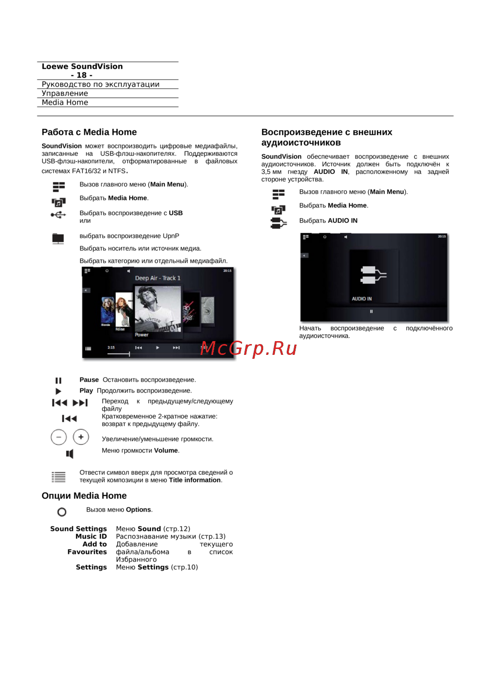 - Loewe soundvision обеспечивает удобный доступ к вашей медиатеке это устройство воспроизводит аудио компакт диски обеспечивает приём радиопрограмм с помощью антенны по кабелю или через интернет возможно воспроизведение цифровых музыкальных файлов с usb флэш накопителей и mp3 плееров аналогично тому как это осуществляется в различных устройствах apple p.8