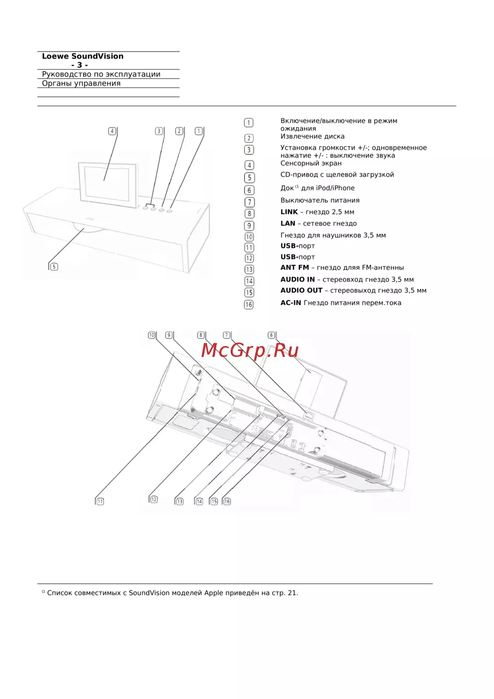 - Loewe soundvision обеспечивает удобный доступ к вашей медиатеке это устройство воспроизводит аудио компакт диски обеспечивает приём радиопрограмм с помощью антенны по кабелю или через интернет возможно воспроизведение цифровых музыкальных файлов с usb флэш накопителей и mp3 плееров аналогично тому как это осуществляется в различных устройствах apple p.8