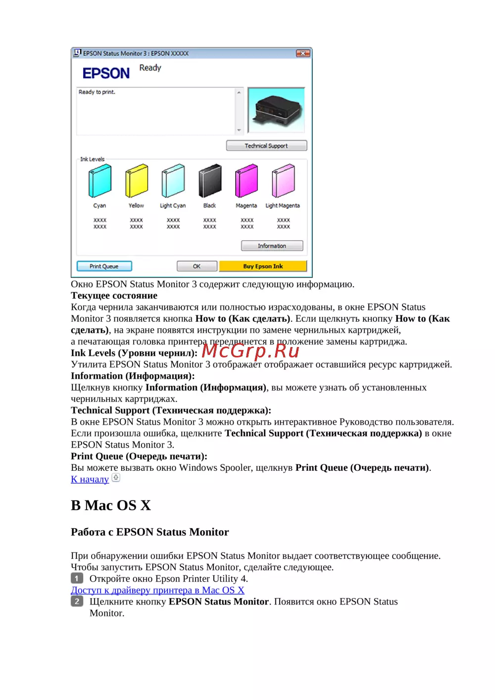 В8окне EPSON8Status8Monitor83 можно открыть интерактивное Руководство пользователя.