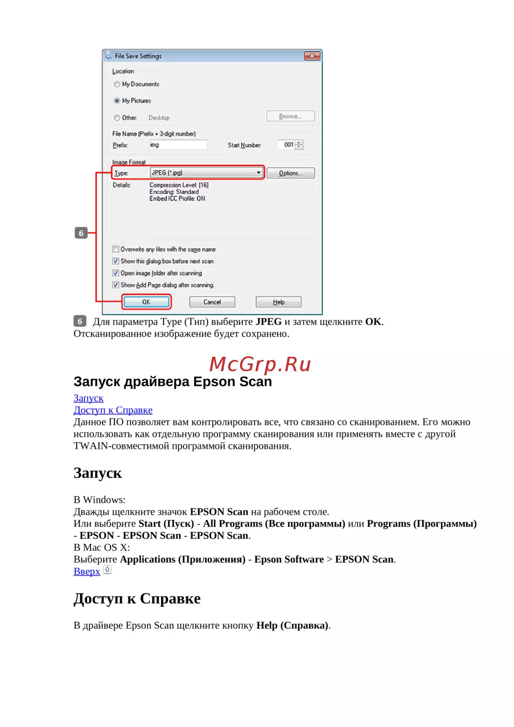 В драйвере Epson Scan щелкните кнопку Help (Справка).