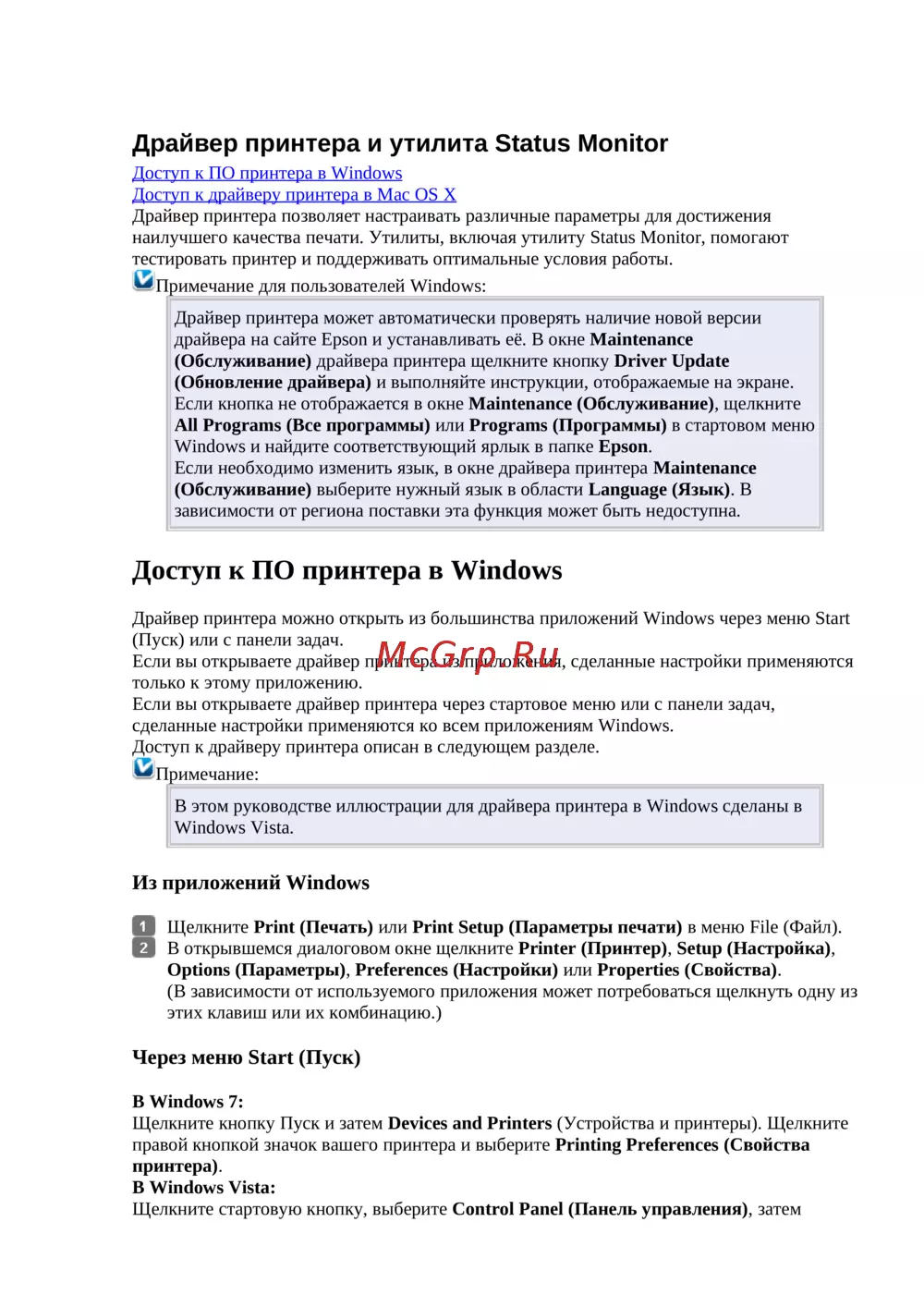Драйвер принтера можно открыть из большинства приложений Windows через меню Start