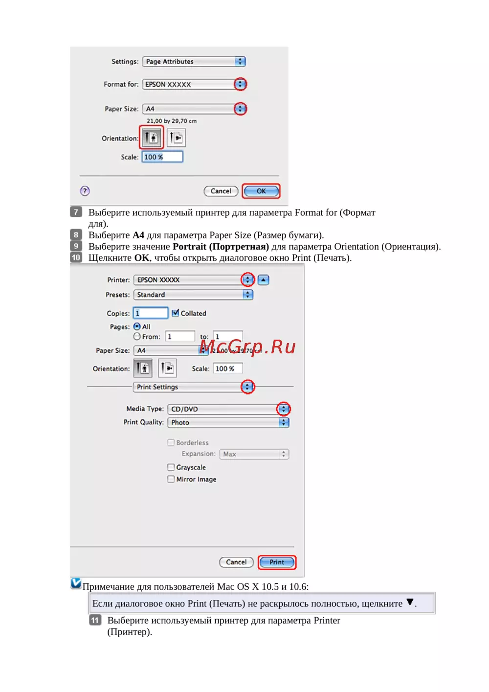 Примечание для пользователей Mac OS X 10.5 и 10.6: