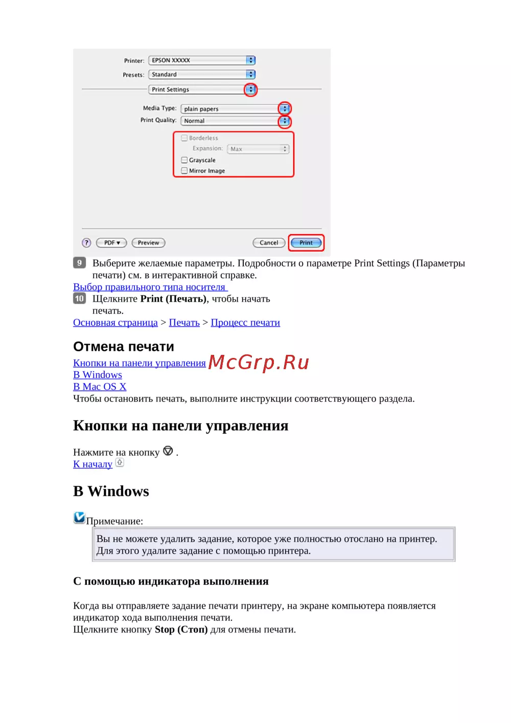Чтобы остановить печать, выполните инструкции соответствующего раздела.
