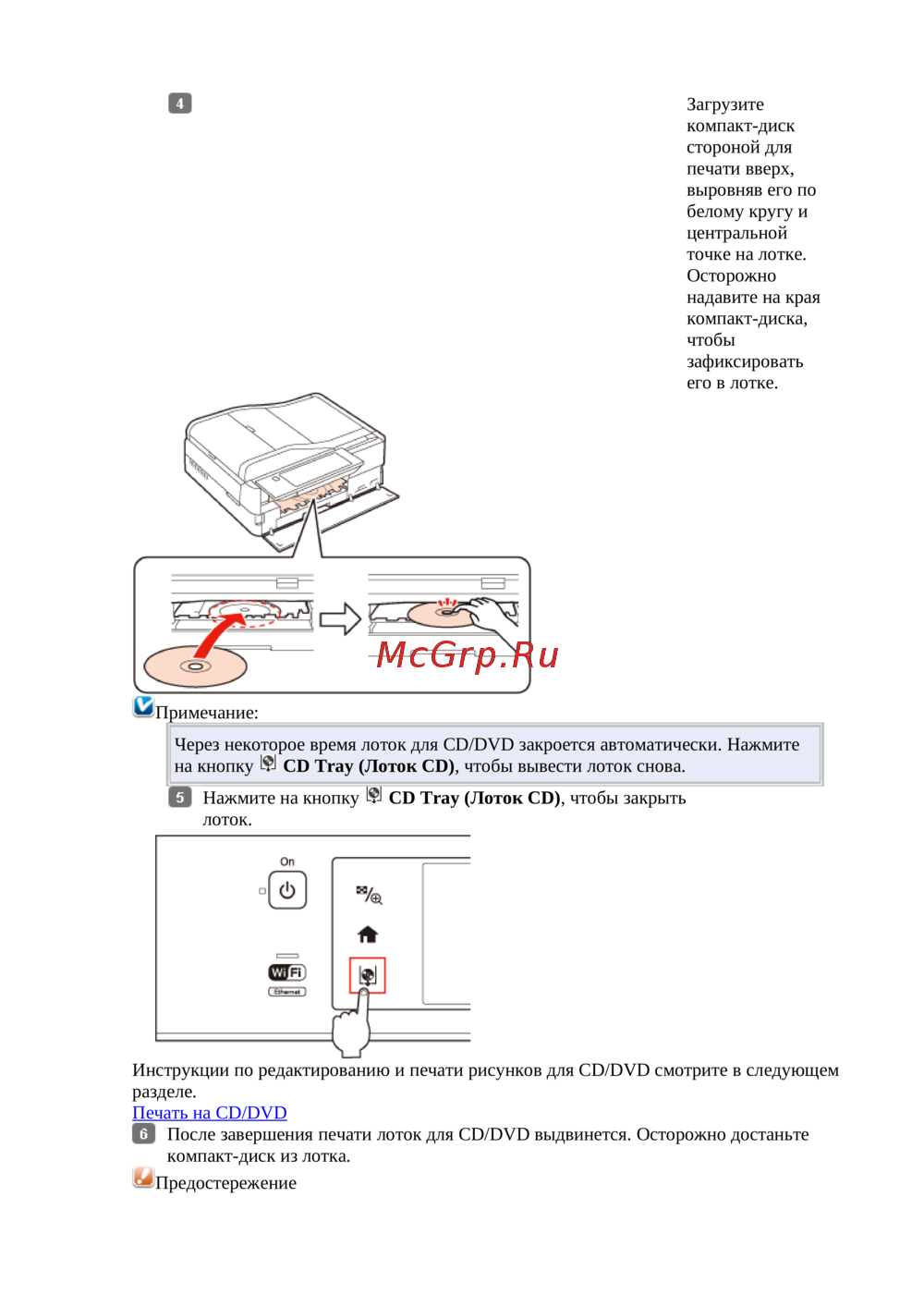 После завершения печати лоток для CD/DVD выдвинется. Осторожно достаньте