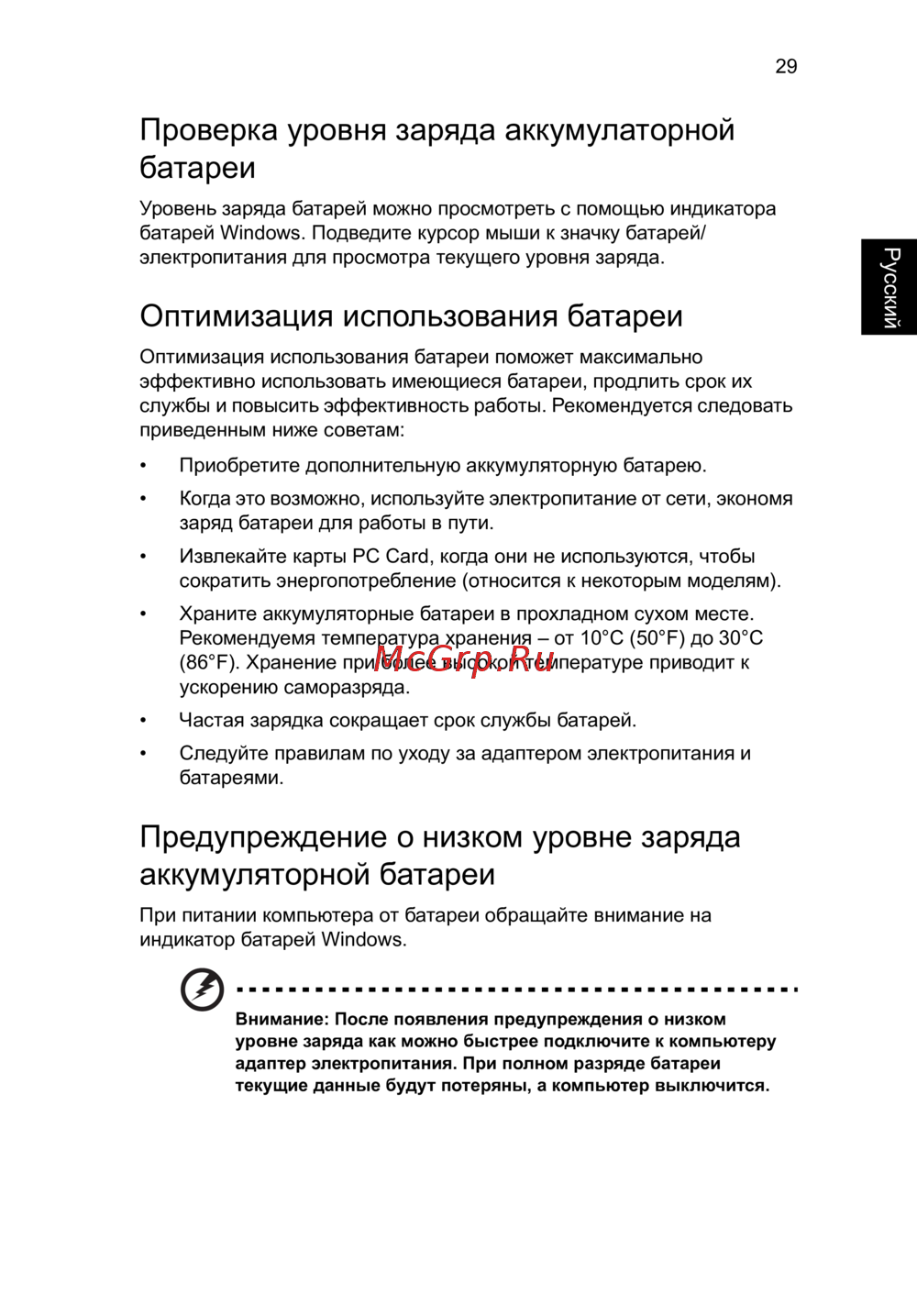 - При появлении предупреждения о низком уровне заряда необходимо предпринять одно из следующих действий p.52
