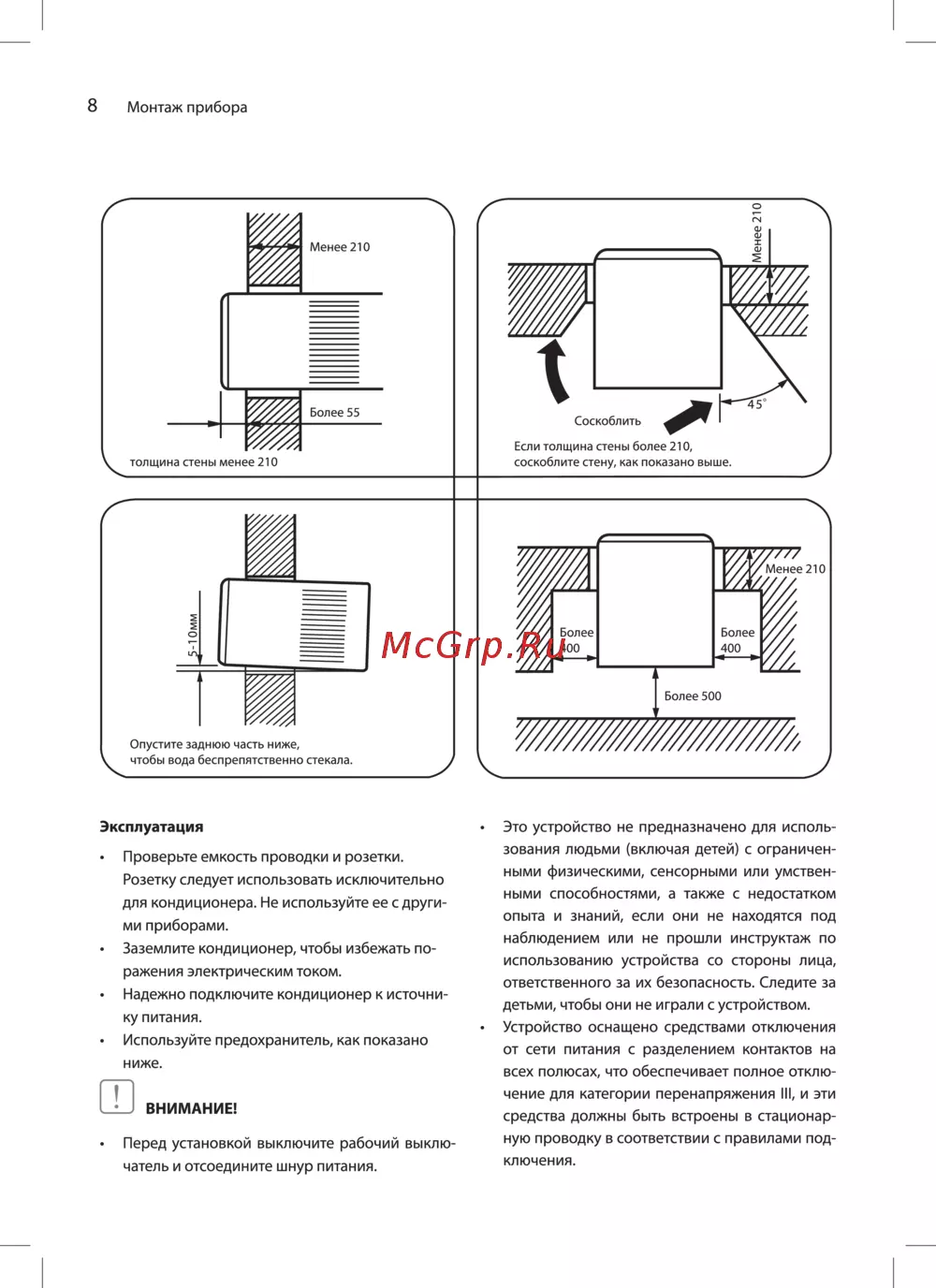 8 Монтаж прибора Эксплуатация Проверьте емкость проводки и розетки Розетку следует использовать исключительно для кондиционера Не используйте ее с други ми приборами Заземлите кондиционер чтобы избежать по ражения электрическим током Надежно подключите кондиционер к источни ку питания Используйте предохранитель как показано ниже Это устройство не предназначено для исполь зования людьми включая детей с ограничен ными физическими сенсорными или умствен ными способностями а также с недостатком опыта и знаний если они не находятся под наблюдением или не прошли инструктаж по использованию устройства со стороны лица ответственного за их безопасность Следите за детьми чтобы они не играли с устройством Устройство оснащено средствами отключения от сети питания с разделением контактов на всех полюсах что обеспечивает полное отклю чение для категории перенапряжения III и эти ВНИМАНИЕ Перед установкой выключите рабочий выклю чатель и отсоедините шнур питания средства должны быть встроены в стационар ную проводку в соответствии с правилами под ключения