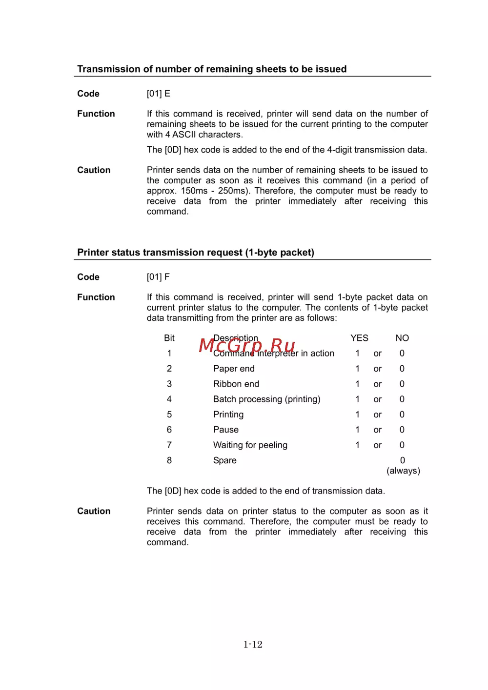 - Printer status transmission request 8 byte packet p.11