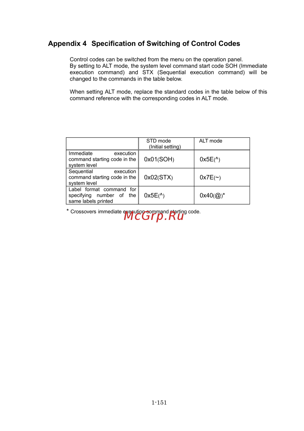 - Control codes can be switched from the menu on the operation panel by setting to alt mode the system level command start code soh immediate execution command and stx sequential execution command will be changed to the commands in the table below when setting alt mode replace the standard codes in the table below of this command reference with the corresponding codes in alt mode p.152