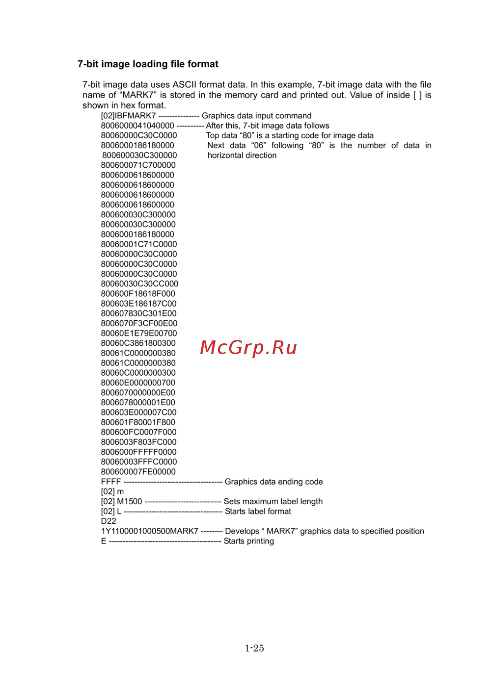 - Bit image data uses ascii format data in this example 7 bit image data with the file name of mark7 is stored in the memory card and printed out value of inside is shown in hex format p.26