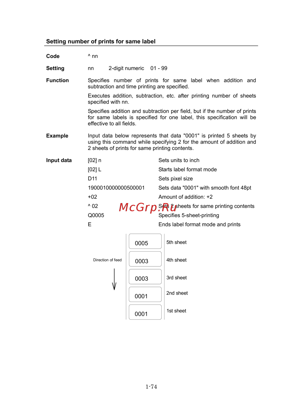 Input data below represents that data "0001" is printed 5 sheets by