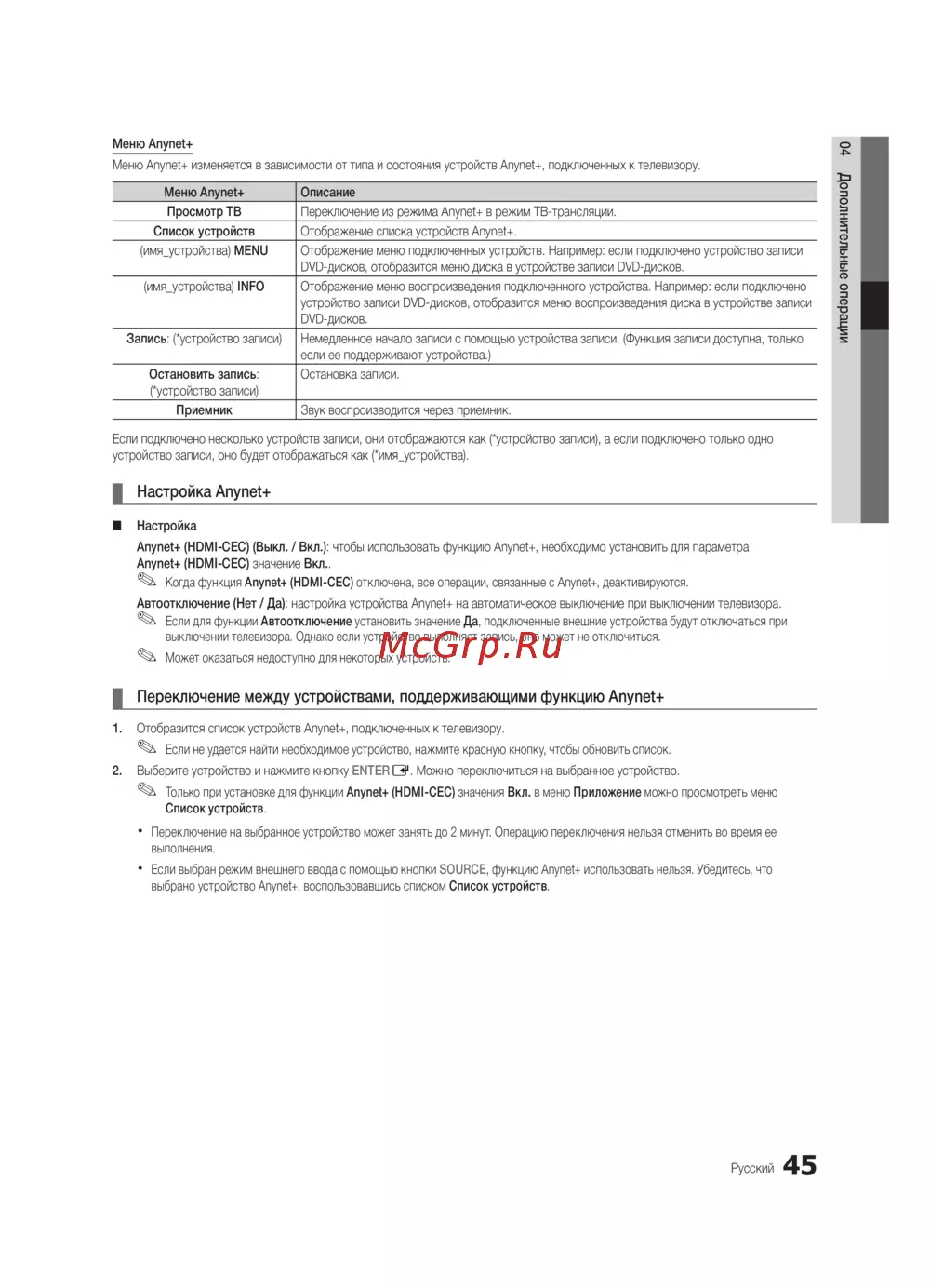 ¦ Переключение между устройствами, поддерживающими функцию Anynet+