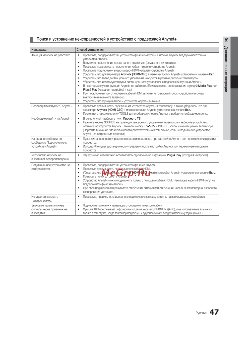 • В некоторых случаях функция Anynet+ не работает. (Поиск каналов, использование функций Media Play или