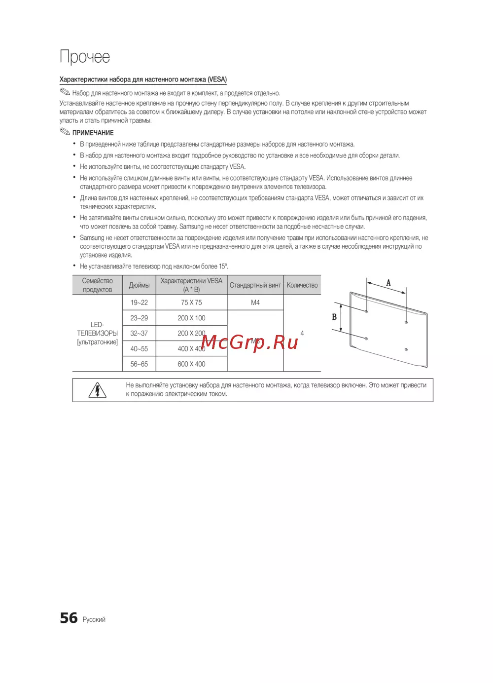 Samsung не несет ответственности за повреждение изделия или получение травм при использовании настенного крепления, не