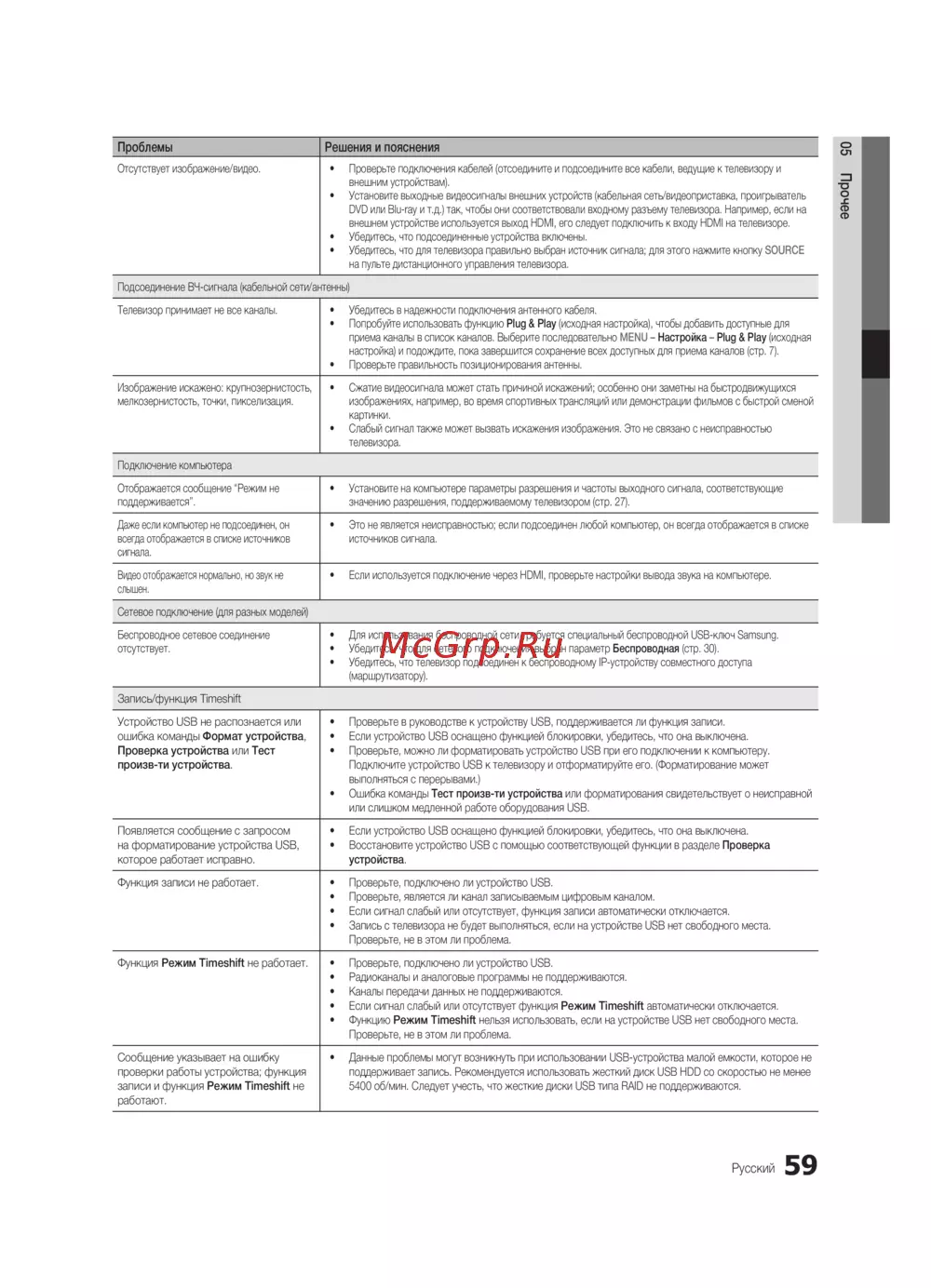 Отсутствует изображение/видео. • Проверьте подключения кабелей (отсоедините и подсоедините все кабели, ведущие к телевизору и