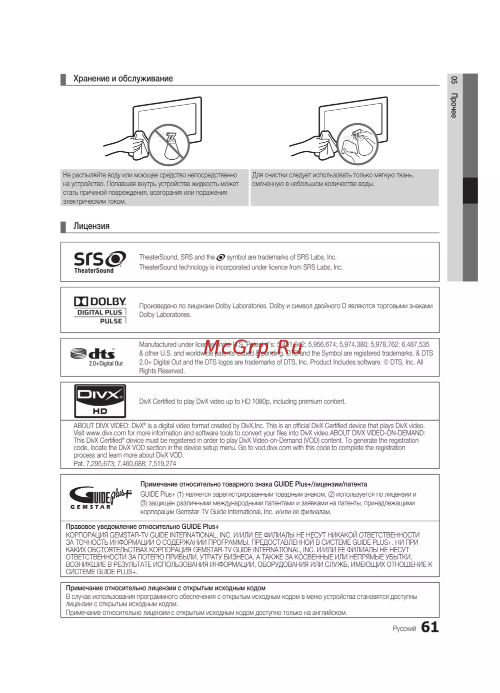 Примечание относительно товарного знака GUIDE Plus+/лицензии/патента