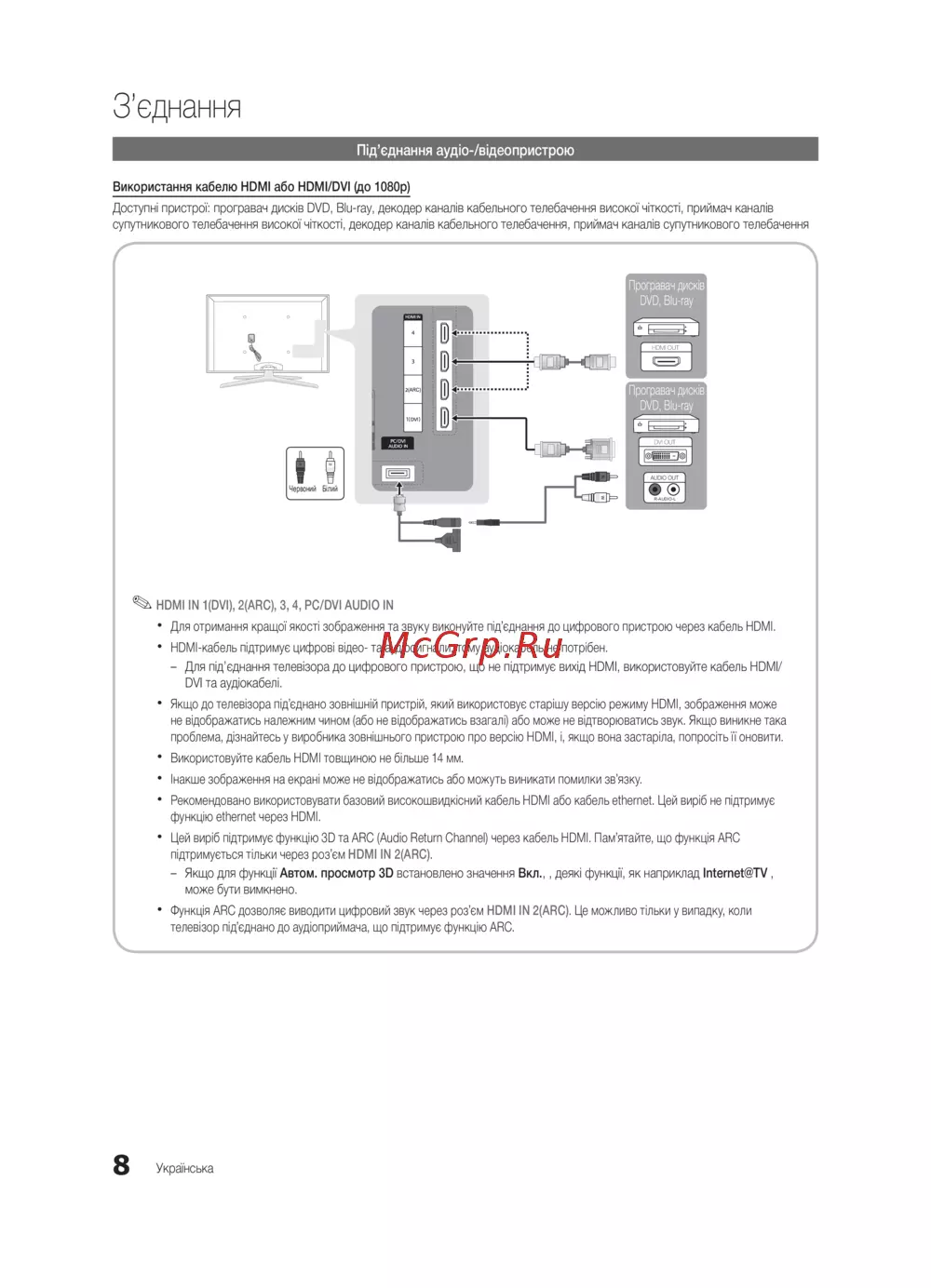 Цей виріб підтримує функцію 3D та ARC (Audio Return Channel) через кабель HDMI. Пам’ятайте, що функція ARC