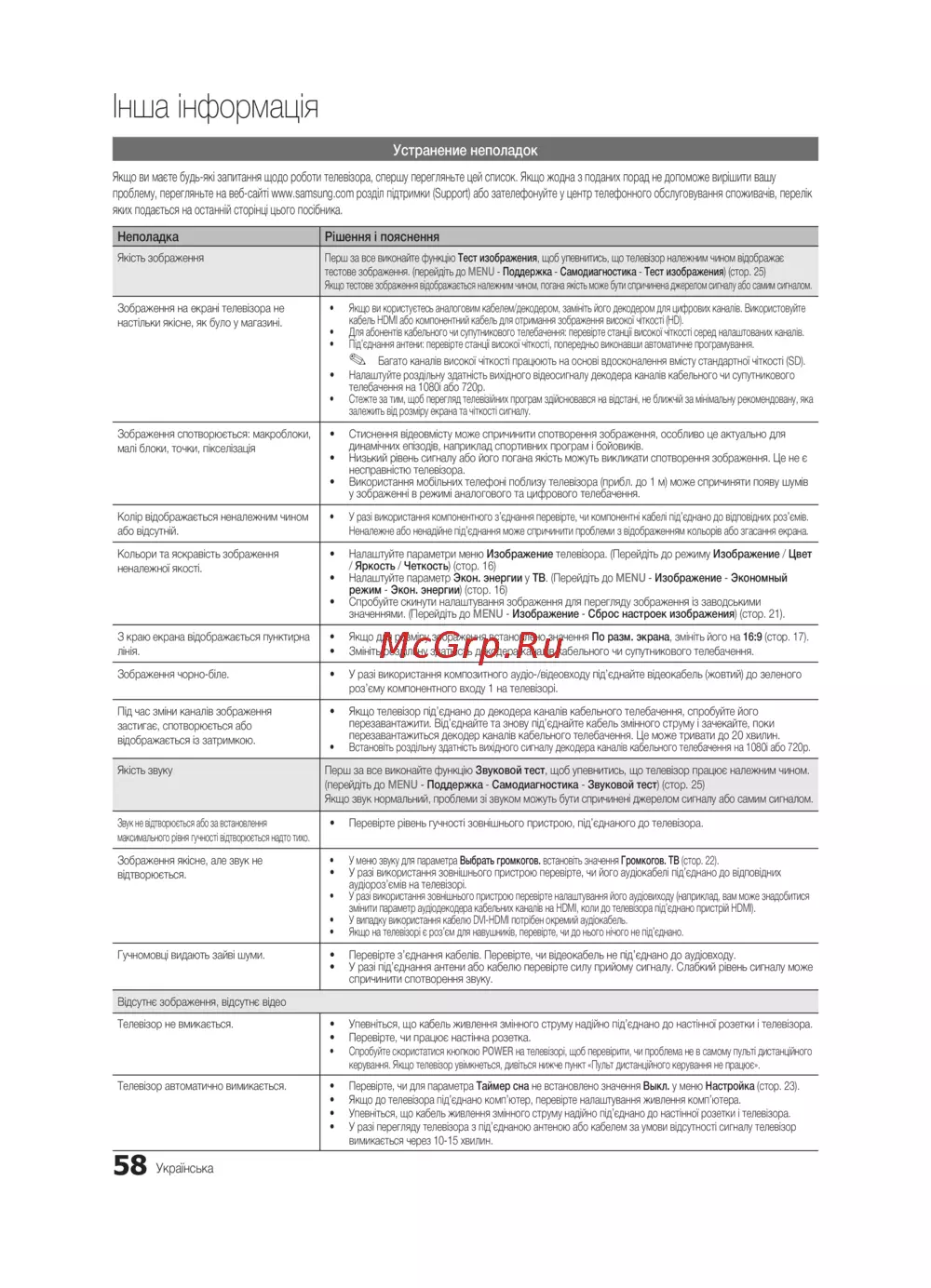тестове зображення. (перейдіть до MENU - Поддержка - Самодиагностика - Тест изображения) (стор. 25)