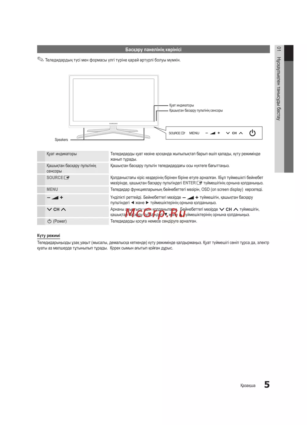 MENU Теледидар функцияларының бейнебеттегі мәзірін, OSD (on screen display) көрсетеді.
