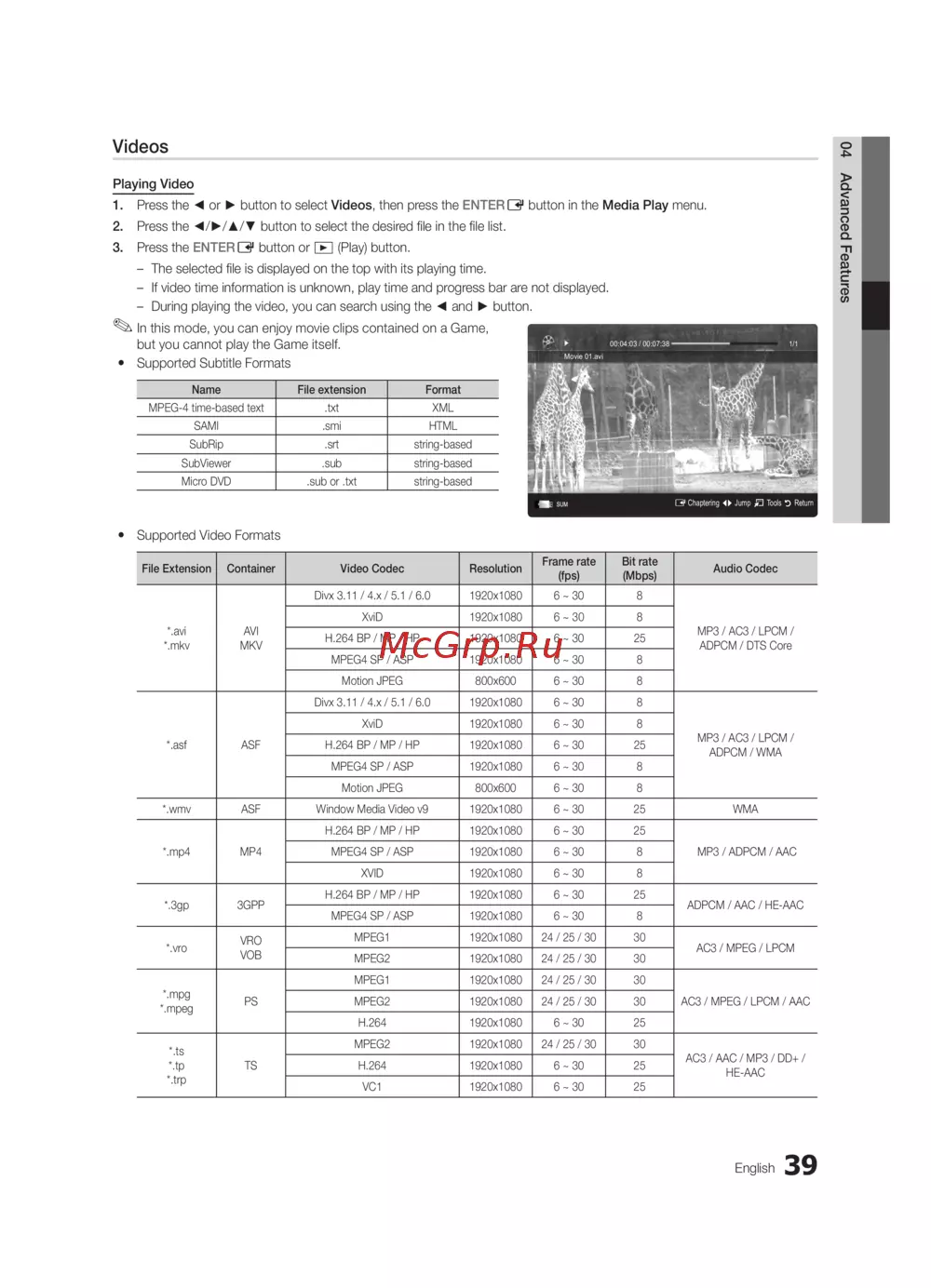 MP3 / ADPCM / AACMPEG4 SP / ASP 1920x1080 6 ~ 30 8