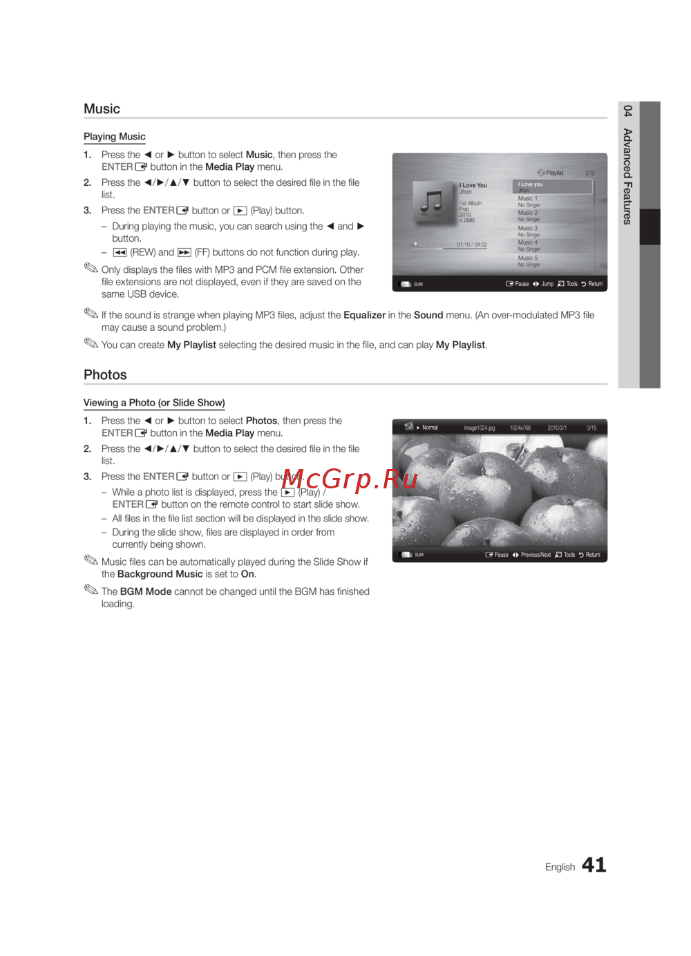 If the sound is strange when playing MP3 files, adjust the Equalizer in the Sound menu. (An over-modulated MP3 file
