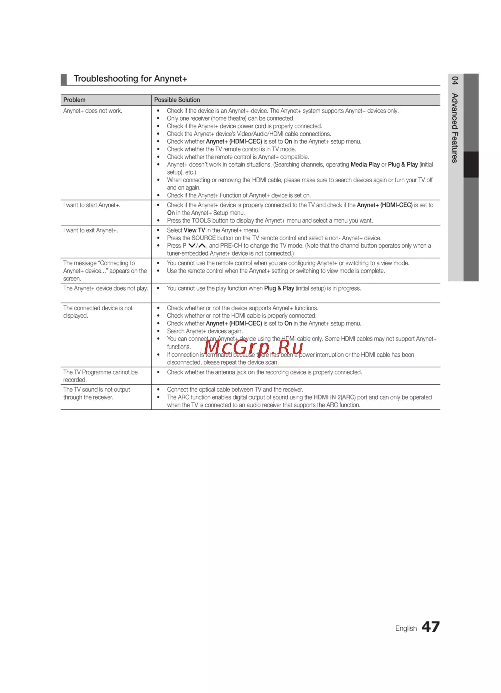 Anynet+ does not work. • Check if the device is an Anynet+ device. The Anynet+ system supports Anynet+ devices only.