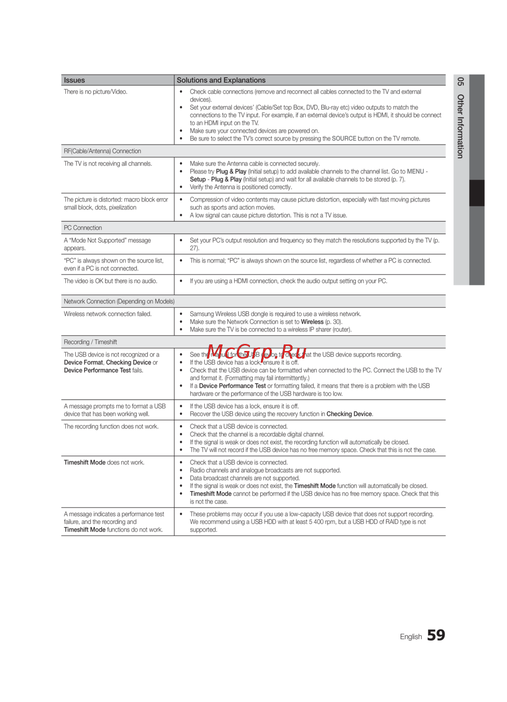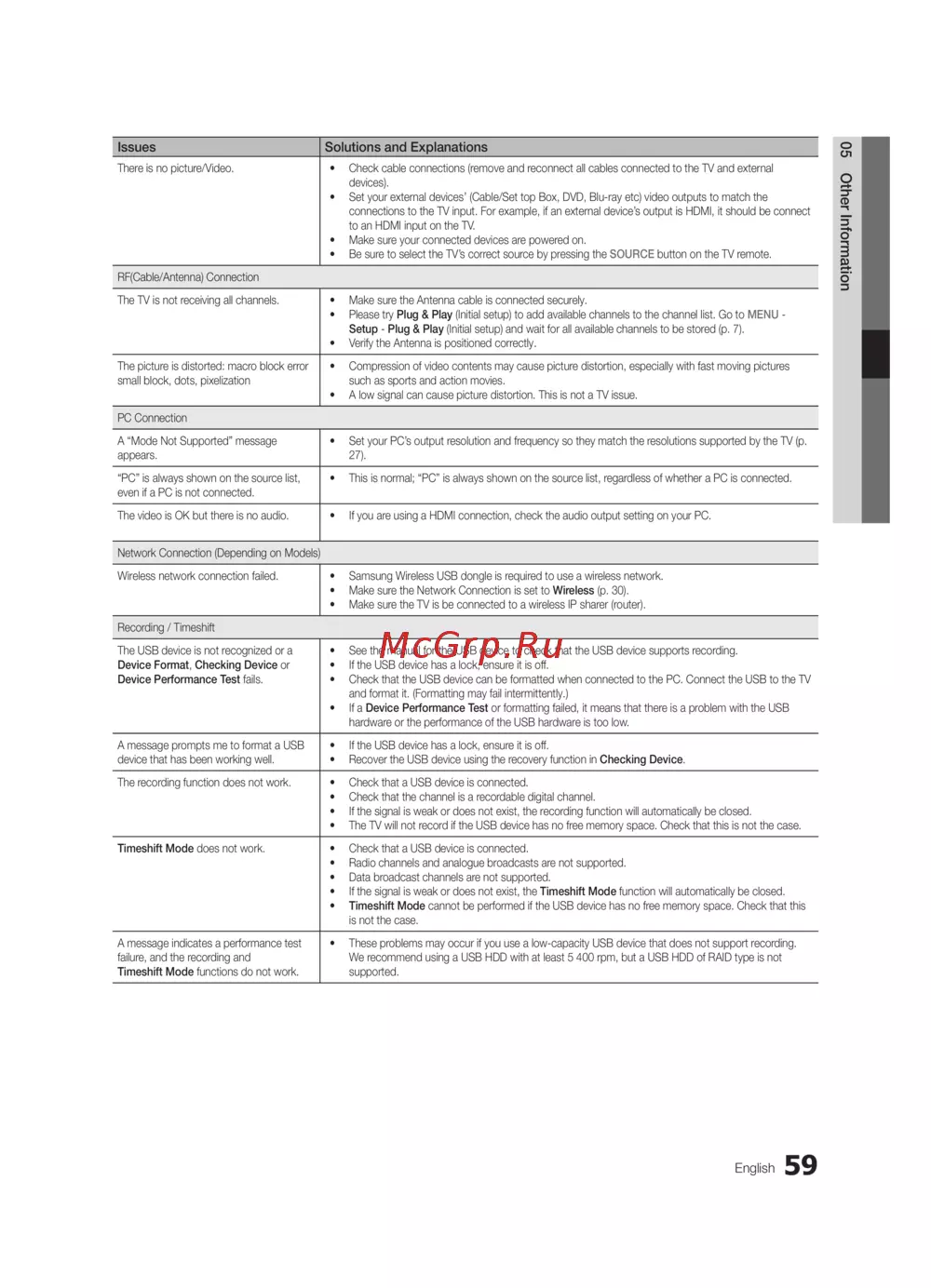 There is no picture/Video. • Check cable connections (remove and reconnect all cables connected to the TV and external