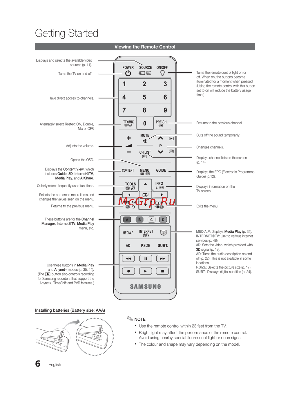 Use the remote control within 23 feet from the TV.