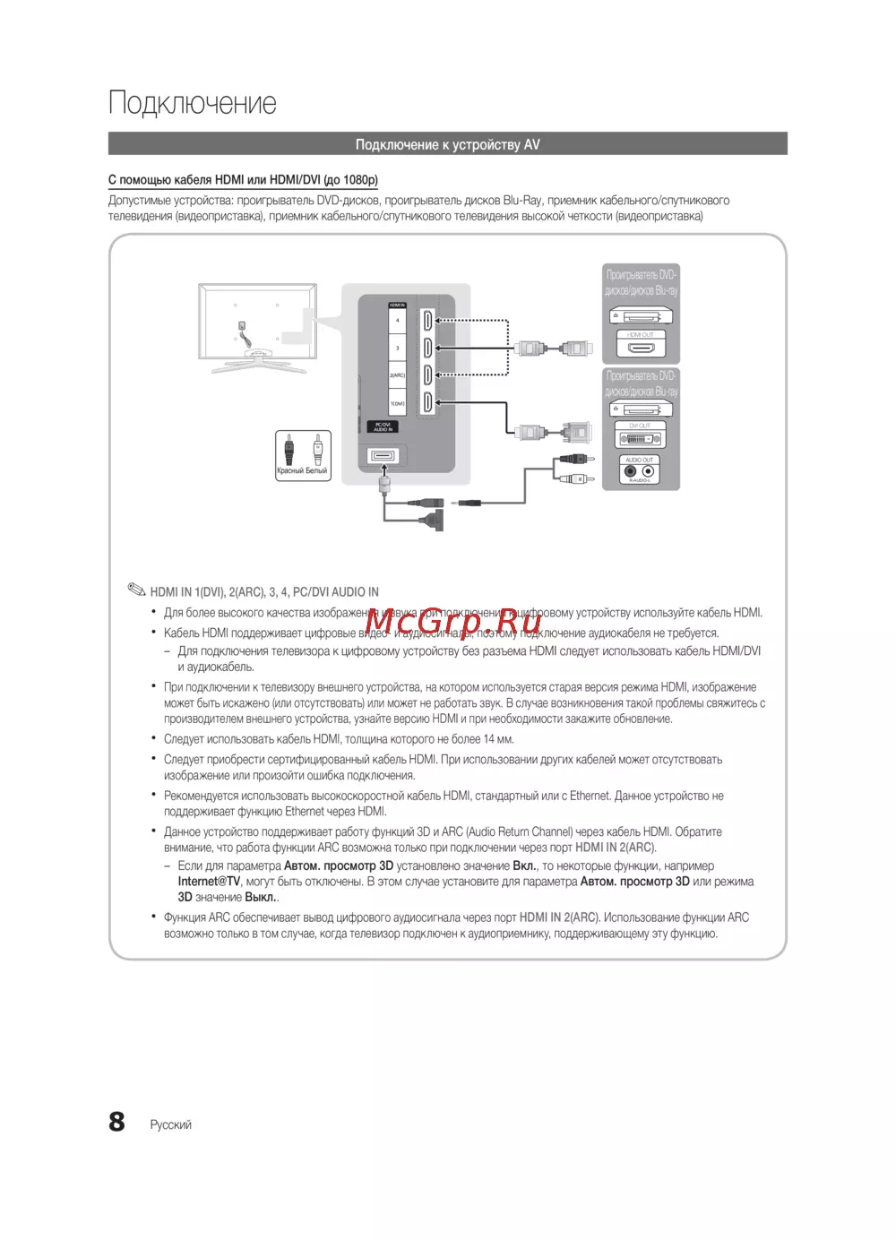 Данное устройство поддерживает работу функций 3D и ARC (Audio Return Channel) через кабель HDMI. Обратите