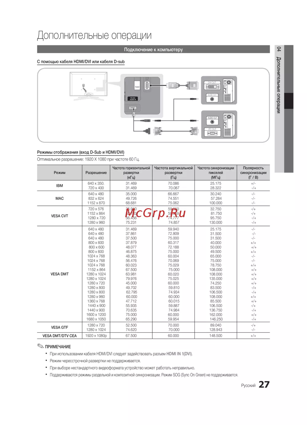 Режимы отображения (вход D-Sub и HDMI/DVI)
