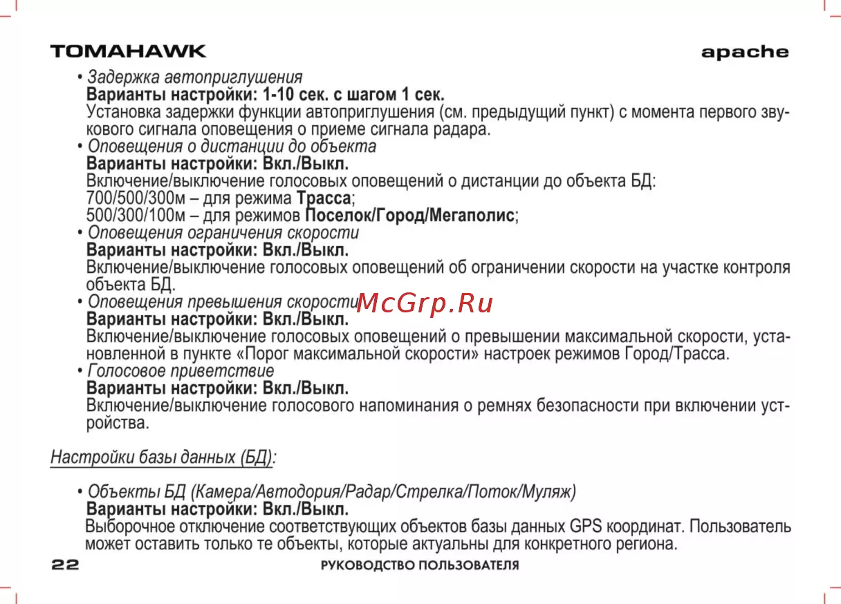 TOMAHAWK apache Задержка автоприглушения Варианты настройки 1 10 сек с шагом 1 сек Установка задержки функции автоприглушения см предыдущий пункт с момента первого зву кового сигнала оповещения о приеме сигнала радара Оповещения о дистанции до объекта Варианты настройки Вкл Выкл Включение выключение голосовых оповещений о дистанции до объекта БД 700 500 300м для режима Трасса 500 300 100м для режимов Поселок Город Мегаполис Оповещения ограничения скорости Варианты настройки Вкл Выкл Включение выключение голосовых оповещений об ограничении скорости на участке контроля объекта БД Оповещения превышения скорости Варианты настройки Вкл Выкл Включение выключение голосовых оповещений о превышении максимальной скорости уста новленной в пункте Порог максимальной скорости настроек режимов Город Трасса Голосовое приветствие Варианты настройки Вкл Выкл Включение выключение голосового напоминания о ремнях безопасности при включении уст ройства Настройки базы данных БД Объекты БД Камера Автодория Радар Стрелка Поток Муляж Варианты настройки Вкл Выкл Выборочное отключение соответствующих объектов базы данных GPS координат Пользователь может оставить только те объекты которые актуальны для конкретного региона 22 РУКОВОДСТВО ПОЛЬЗОВАТЕЛЯ