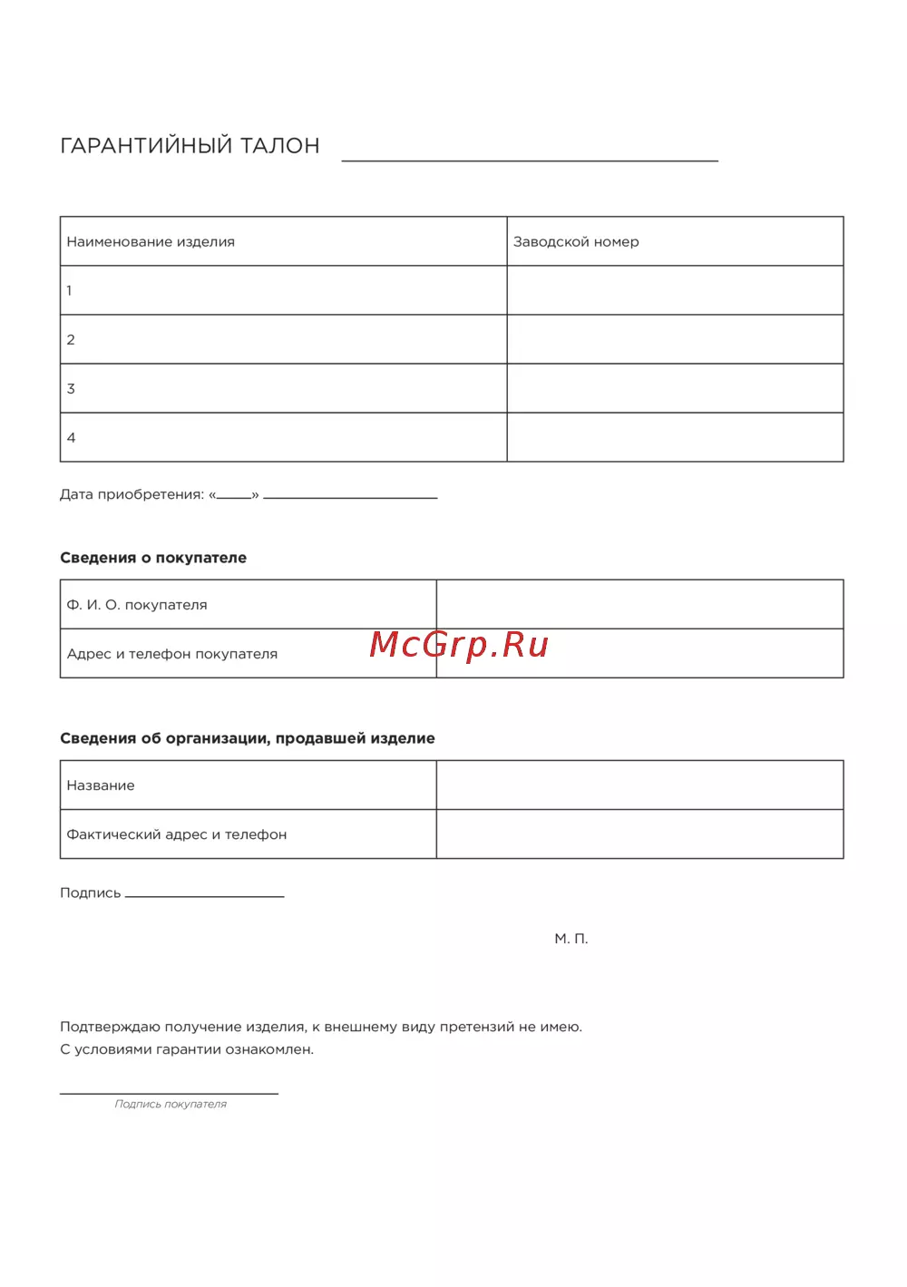 - Сведения об организации продавшей изделие p.46