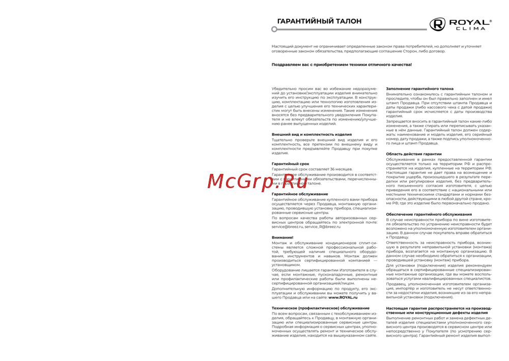 - Уважаемый покупатель поздравляем вас с покупкой и благодарим за удачный выбор кондиционера воздуха бренда royal clima перед началом эксплуатации прибора просим вас внимательно ознакомиться с руководством по эксплуатации p.3