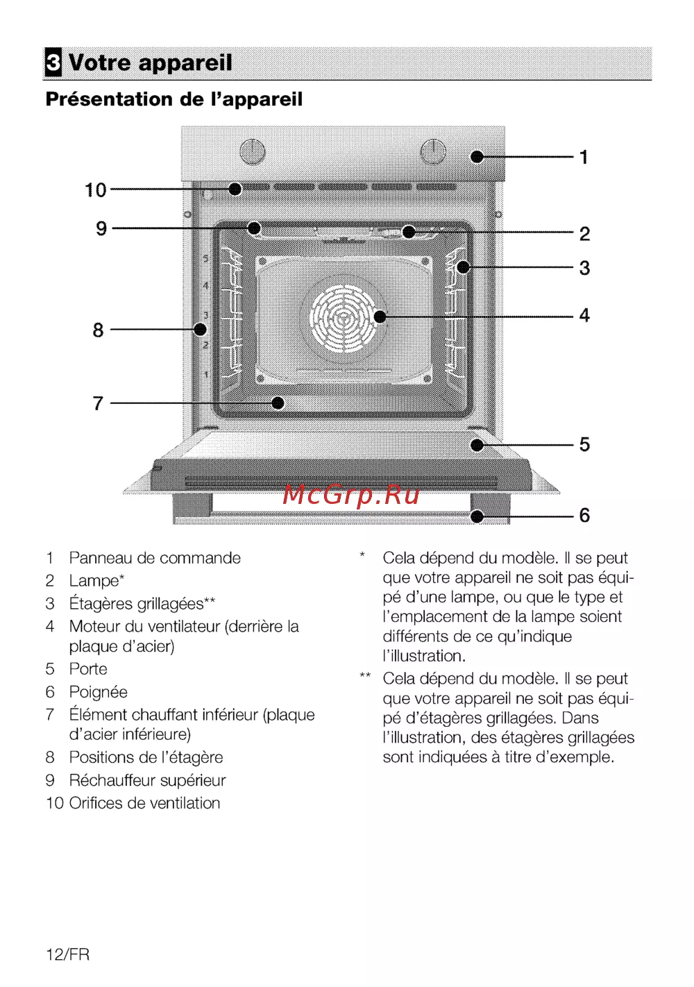 2 Votre appareil Présentation de l appareil 1 Panneau de commande 2 Lampe 3 Étagères grillagées 4 Moteur du ventilateur derrière la plaque d acier 5 Porte 6 Poignée 7 Élément chauffant inférieur plaque d acier inférieure 8 Positions de l étagère 9 Réchauffeur supérieur 10 Orifices de ventilation 12 FR Cela dépend du modèle Il se peut que votre appareil ne soit pas équi pé d une lampe ou que le type et l emplacement de la lampe soient différents de ce qu indique l illustration Cela dépend du modèle Il se peut que votre appareil ne soit pas équi pé d étagères grillagées Dans l illustration des étagères grillagées sont indiquées à titre d exemple
