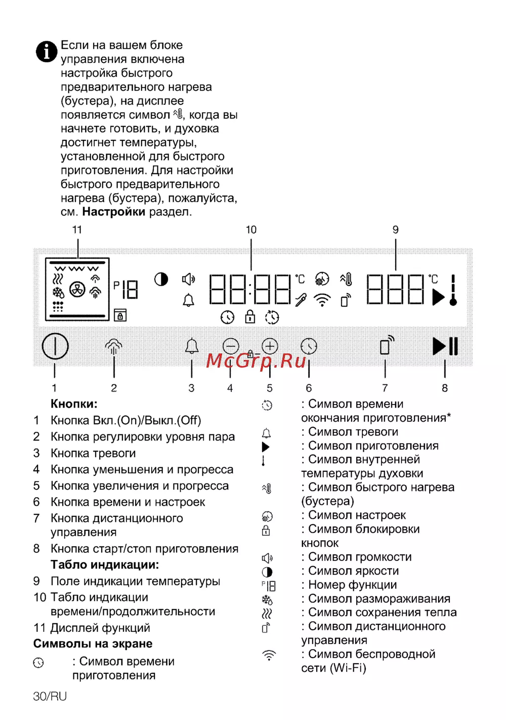 Если на вашем блоке включена О управления настройка быстрого предварительного нагрева бустера на дисплее появляется символ когда вы начнете готовить и духовка достигнет температуры установленной для быстрого приготовления Для настройки быстрого предварительного нагрева бустера пожалуйста см Настройки раздел 11 9 О 1 2 3 4 5 Кнопки Кнопка Вкл Оп Выкл ОЯ Кнопка регулировки уровня пара Кнопка тревоги Кнопка уменьшения и прогресса Кнопка увеличения и прогресса Кнопка времени и настроек Кнопка дистанционного управления й 8 Кнопка старт стоп приготовления Табло индикации Э 9 Поле индикации температуры Р1В 10 Табло индикации времени продолжительности 11 Дисплей функций о Символы на экране Символ времени приготовления 1 2 3 4 5 6 7 30 RU 6 о Ml 7 8 Символ времени окончания приготовления Символ тревоги Символ приготовления Символ внутренней температуры духовки Символ быстрого нагрева бустера Символ настроек Символ блокировки кнопок Символ громкости Символ яркости Номер функции Символ размораживания Символ сохранения тепла Символ дистанционного управления Символ беспроводной сети Wi Fi