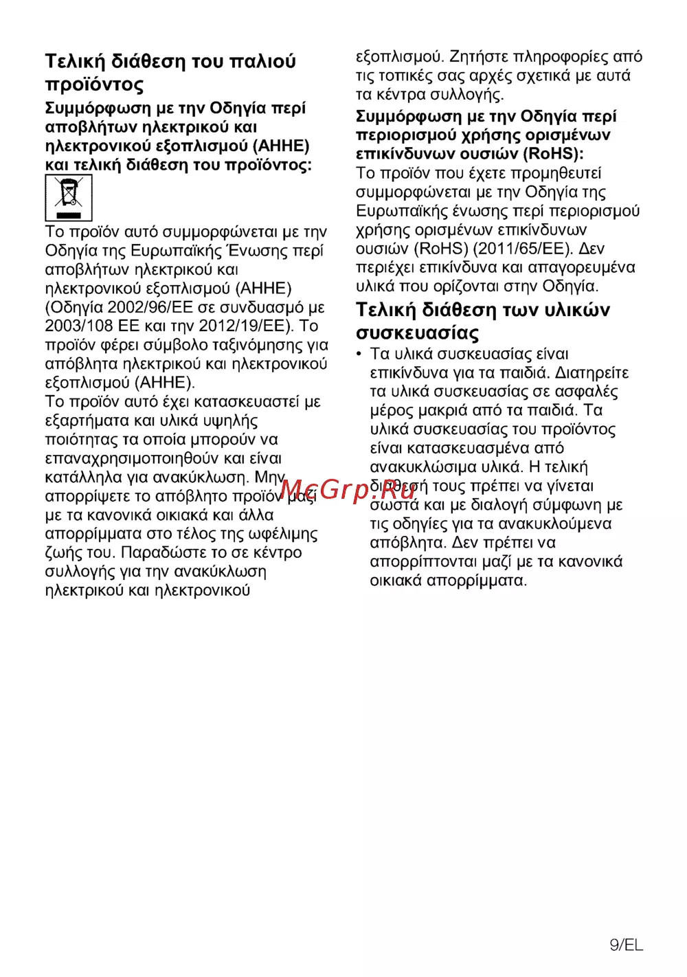 TEAIKQ 6iá0 aq тои ттаЛюй TTpOÏÔVTOÇ Ниррорфыаг pe TQV Обпу а TTEPÍ anoßAt Ttov пАектржой KOI r À KTpoviKOÙ eÇonÀiopoù АННЕ KOI TEÁIKIÍ 5iá0ear тои TTPOÏÔVTOÇ То npóíóv auTó оиррорфсоуета pe TQV Обруба T0Ç EupconaïKiiç Evcoonç nepí anoßAiiTiov qÁeKTpiKoú KOI qÁeKTpoviKoú eÇoTTÀiopoù АННЕ Обруба 2002 96 ЕЕ ое ouvóuaopó pe 2003 108 ЕЕ Kai TQV 2012 19 EE TO npoíóv cpépei oüpßoAo TaÇivôpr or ç Yia anoßAqTa qÁeKTpiKoú Kai qÁeKTpoviKoú eÇonÀiopoù АННЕ To TTpoíóv auTó XEI катаокеиаоте pe е артррата KOI UÁIKÓ uipqÀiiç TToiôTr Taç та OTTOÍO pTTopoúv va eTTavaxpnaipoTToinOoúv KOI eívai катбЛЛрЛа ую avaKÚKÁcoor Mqv апорркрете то anoßAqTo TTpoíóv pa í pe та KavoviKá OIKIOKÓ KOI áÁÁa aTToppíppaía ото TÉÀOÇ TQÇ uxpéÀipnç Ccoiiç тои Парабсооте то oe KévTpo OUÀÀOYÔÇ Yia T0v avaKÚKÁcoor qÀeKTpiKoù KOI qÀeKTpoviKoù e onÀiopoù Zr Tr OTe пЛпрофор ед anó TOTTiKéç oaç apxéç OXETIKÓ pe auîà та KévTpa OUÀÀOYÔÇ TIÇ Zuppópcptüar ре TQV O6nY a nepí nepiopiopoú хРПаП opiopévtov ETTIKÍVSUVÜJV ouaiúv RoHS То TTpoíóv пои ÉXETE npopr 0 UTeí оиррорф л уета1 pe TQV OôrjYia TQÇ EupüjnàiKQÇ évüjonç nepí nepiopiopoú XprpQÇ opiopévwv eniKívóuvwv ouoicóv RoHS 2011 65 EE Aev nepiéxEi eniKívóuva KOI anaYopeupéva UÁIKÓ пои opí ovTai отру Обру TEÁIKIÍ SiáOeaq TWV UÁIKÚV auaKEuaaiaç Ta UÁIKÓ ouoKEuaoiaç eívai eniKívóuva Yia та naióiá AiaTnpeíTe та UÁIKÓ ouoKEuaoiaç ne aocpaÀéç pépoç ракрю anó та naióiá Та UÁIKÓ ouoKEuaoiaç тои npoïôvToç eívai KaTaoKEuaopéva anó avaKUKÁcóoipa UÁIKÓ H TEÁIKIÍ óiáOeoií TOUÇ npénei va YÍVETOI OCOOTÓ KOI pe 6iaÁ0YÓ oúpcpcuvr pe TIÇ o6r YÎ Ç Yia Ta avaKUKÁoúpeva anoßAqTa Àev npénei va anoppínTovTai paÇÎ ре та KOVOVIKÓ OIKIOKÓ anoppippaîa 9 EL