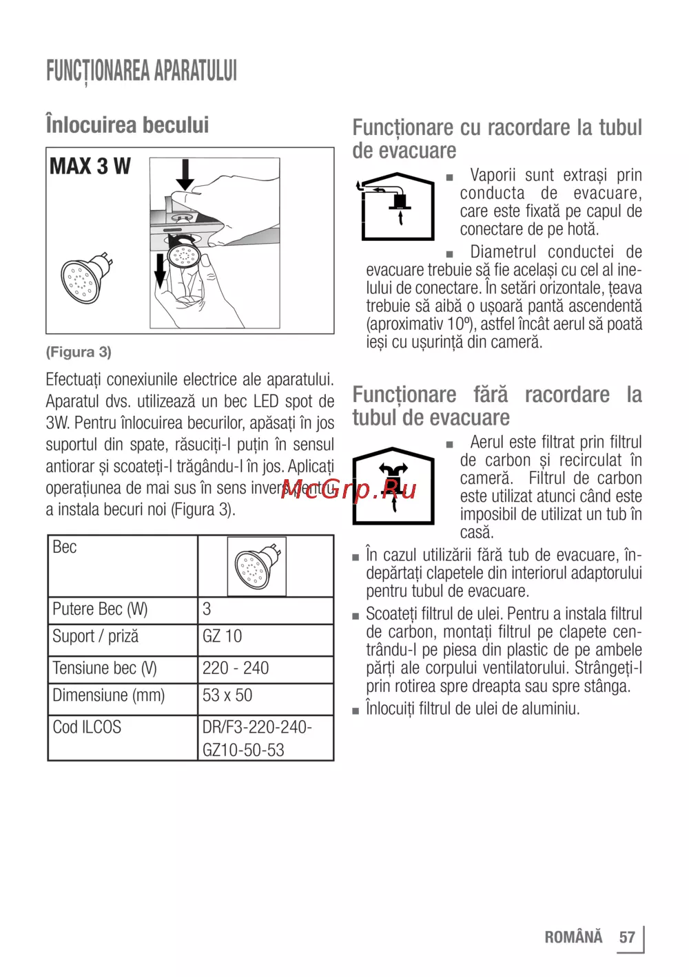 3W. Pentru înlocuirea becurilor, apăsați în jos