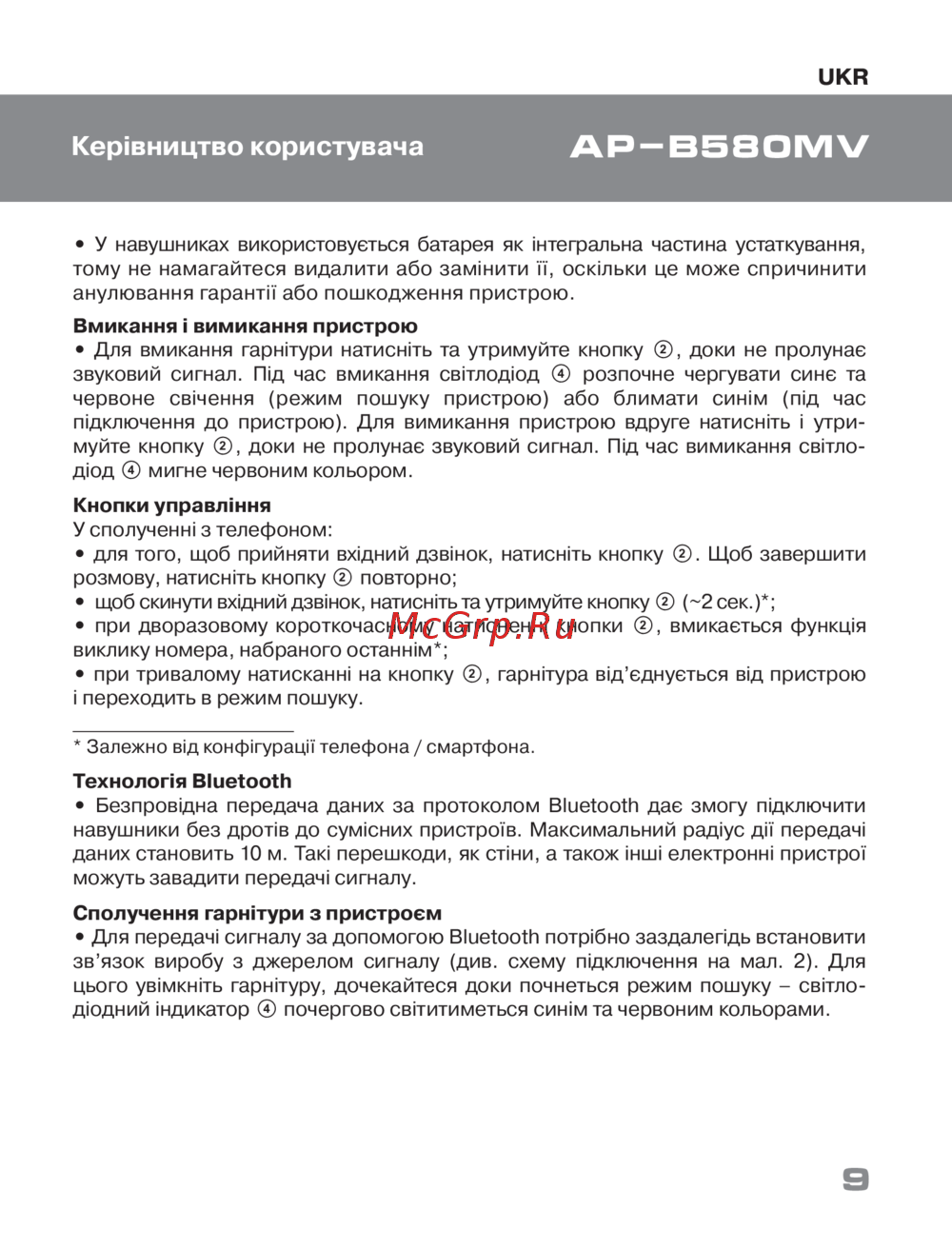 • Для вмикання гарнітури натисніть та утримуйте кнопку b, доки не пролунає
