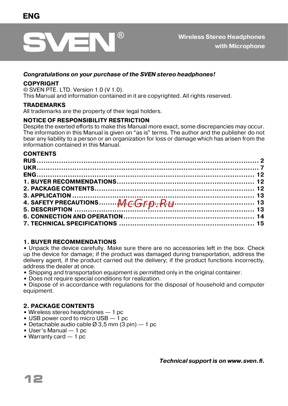 - Техническая поддержка размещена на сайте www sven fi здесь же вы сможете найти обновленную версию данного руководства p.2