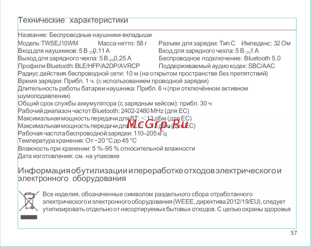 Масса нетто: 58 г Разъем для зарядки: Тип С Импеданс: 32 Ом